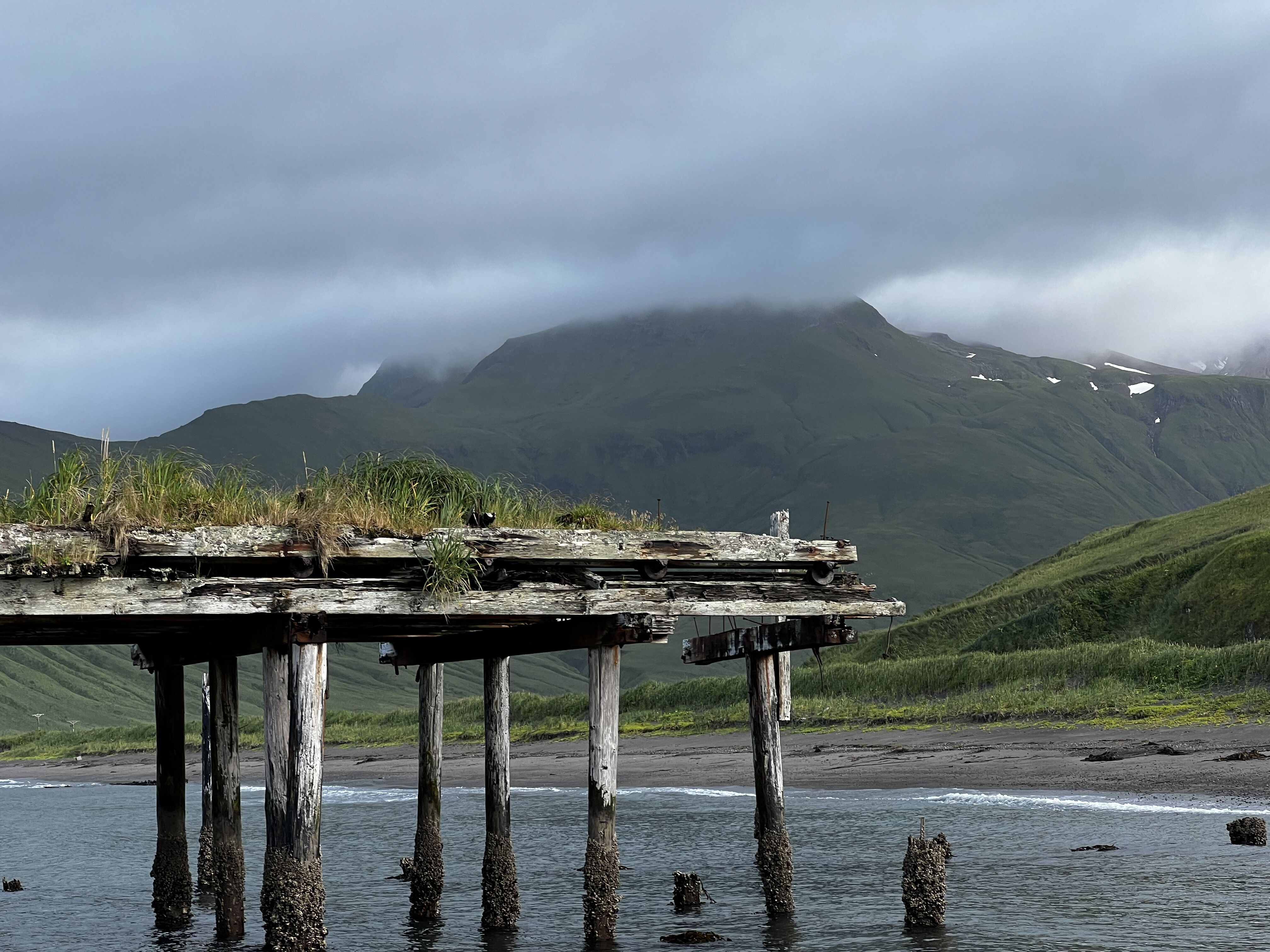 On August 20th, we woke to fine views of Great Sitkin Volcano which intermittently displayed its glowing lava dome through the clouds prior to dawn. The expedition landing this morning was near the head of Sand Bay, on the southeast side of the active volcano on Great Sitkin Island. The ~6,000-foot volcano has been active since 2020 and we saw steam from hot lava in the dome near the summit. The large flat glacial valleys at the head of Sand Bay contain numerous remains of the large fuel depot that supplied the Allied forces in the Aleutian war against Japanese invaders on Attu and Kiska Islands to the west. The wide sandy beach, broad valley with numerous remains, and steep ridges provided opportunities for a strenuous hike up a steep ridge, exploration of the fuel depot remains, and wandering along the beautiful black-sand beach. Glimpses of Great Sitkin Volcano with snow patches, a lava dome, and steam provided a remarkable backdrop. Dense monkshood, wild celery, fireweed, lupine, and grasses formed a dense thicket above the high tide line.