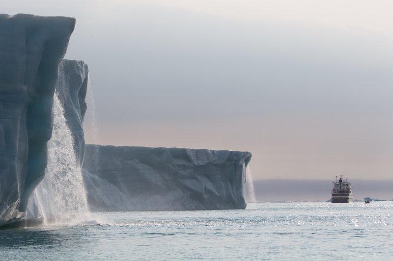We continued to sail along the ice edge, followed by Harp seals popping up and down. No sooner had Captain Martin declared “the ice is perfect” we were starting to turn, heading straight for the ice. “Crashhh boommm”, and the bow strikes. “Bommm, crack crack…” the vibration went all the way to the stern and there they were: in the ice, sailing through ice! Everybody made their way to the bow, admiring the huge and perfectly white pieces of ice as they jostled amongst one another as the National Geographic Orion ploughed through. Sailing along the ide edge, surrounded by a perfect ice scenario at over 81̊N – we certainly had the feeling that we were on the top of the world!
