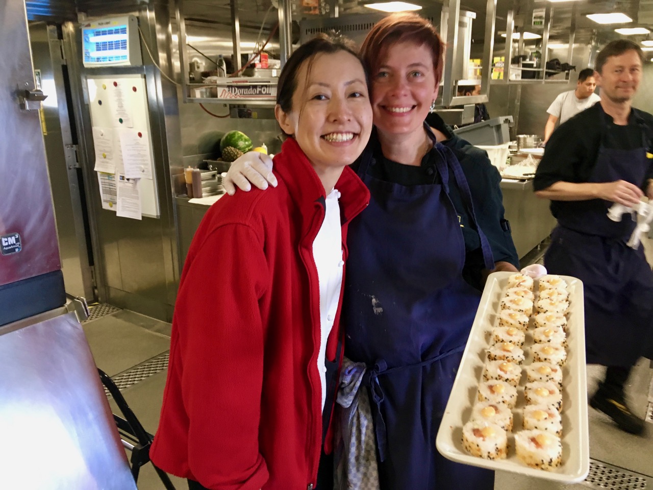 Some of us will definitely think about putting in time at the gym or at least taking a long walk when we arrive in East Falkland to balance all of the tempting treats, delicacies, and great meals. Today, for example, we had a Japanese lunch, a lavish buffet of colors and flavors. In celebration I included a picture of some of the galley team: above from left to right, pastry chef Michiyo Tanaka, executive chef Sara Henstam, and sous chef Magnus Haeggman rushing to his work station.