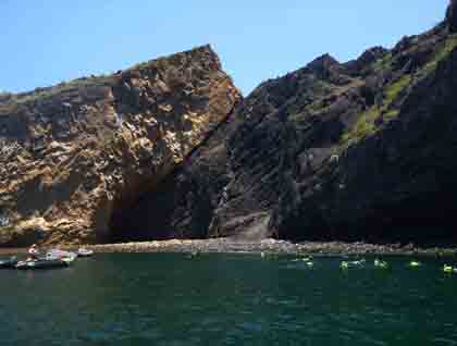 North winds and choppy seas gave us an interesting ride until midnight, when our adventure took a new direction, a southerly one. At first light we entered Bahía Concepción near Mulegé. This area is quite popular because of the protection it provides amongst small picturesque islands and sandy bays. There is a backdrop of rough and ragged volcanic mountains colored like red bricks intermingling with coarse blacks and soft tans of the landscape. Our flexible expedition style allowed for a fleet of kayaks to be quickly readied on the beach of Isla Coyote. Kayakers circumnavigated the island and offshore rocks and enjoyed being captains of their own crafts. Pelicans and frigatebirds were their quiet companions.