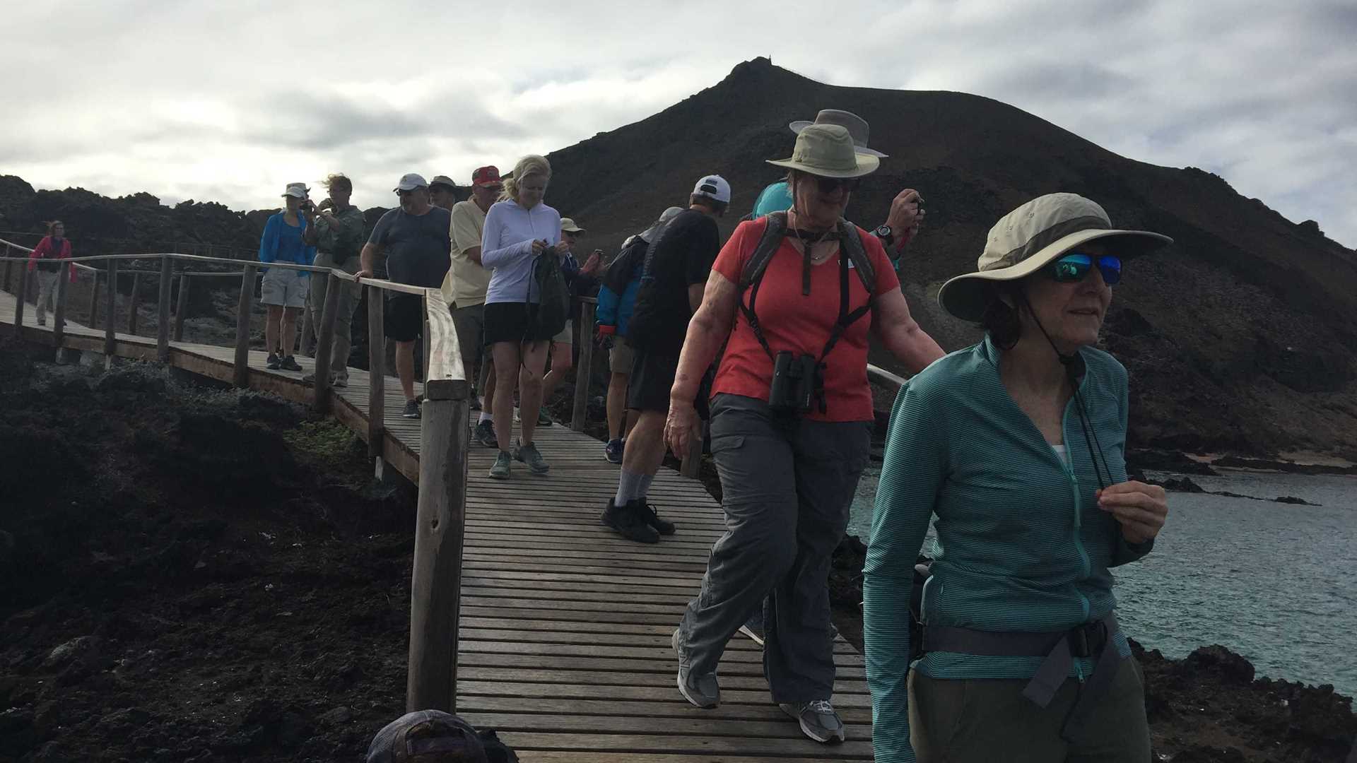 As we began our first full day of exploration, we woke up anchored at Bartolomé Island, which sits in the middle of the archipelago and allows visitors to understand the succession of life here. We identified the pioneer or settler plants during the morning walk up a wooden stairway to the top of this majestic island. From this point, you have the most iconic landscape of the Galapagos. On our return to National Geographic Islander, we had a very well-deserved breakfast waiting for us. Later, we went to a nearby beach to swim and snorkel along the coast. Many of our guests found large schools of fish and marine invertebrates as well as sharks and penguins. After snorkeling, we had a typical Ecuadorian lunch while we sailed to Rábida Island.