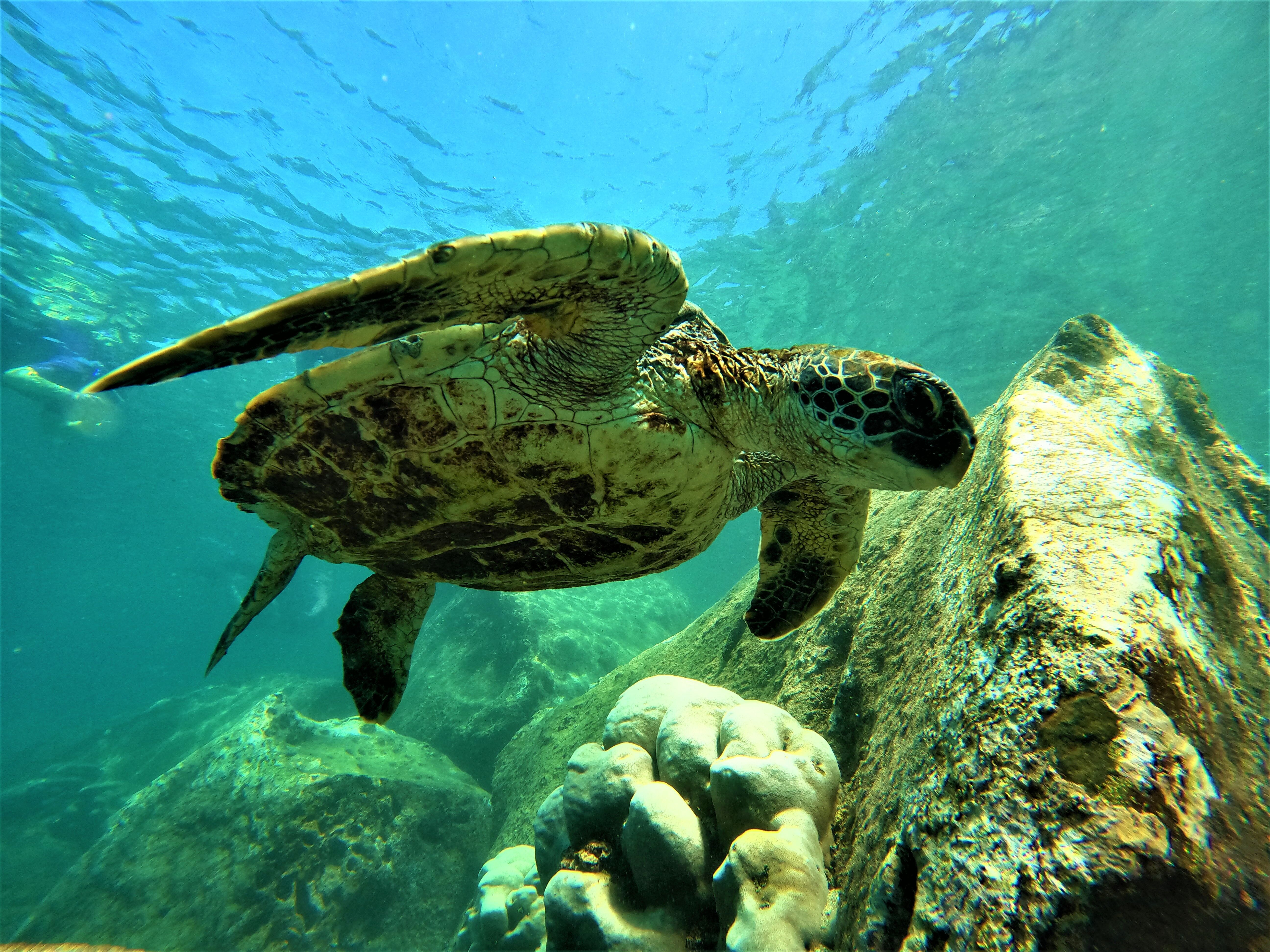 After the beach, we snorkeled under great conditions on the other side of the island. We observed sea lions, sharks, rays, sea stars, several species of fish, and foraging green sea turtles feeding on seaweed. We were surrounded by Galapagos penguins, and we felt accepted as part of this unique environment.