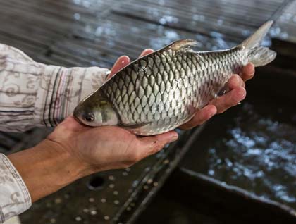 Our morning excursion takes us by covered sampan boats to Binh Thanh Island. We hear about and can see with our own eyes the erosion of the embankments caused by the daily tides and the flooding, which occurs every year from September to November. The way to the island takes us past numerous small scale fish farms of red tilapia. They must have just been fed as a sea of moving reddish shapes can still be seen. Just as we near the island, the local ferry carrying passengers and motorbikes, casts off. It costs only 1000 dong or 5 cents for a foot passenger. At leisure we slowly stroll past houses observing and then trying our hand at the local cottage industry of making sage grass sleeping mats. Pairs of two ladies are quite adept at weaving the mats with simple tools.