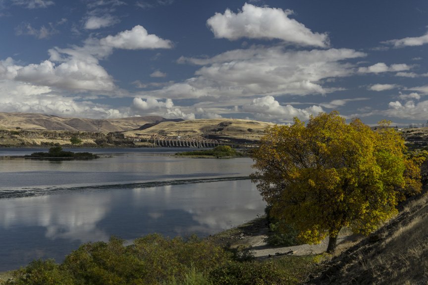 As we passed through the heart of the Cascades today on the Columbia River, we experienced some of the effects of the rain shadow. The morning was fairly drizzly, but the further east we traveled the more dry it became. Lucky us! Under gray skies we entered the locks of the Bonneville dam. Everyone was out on deck, anxious to witness our ship tying off, the lock doors closing, and water rising. A few short moments later we sailed free upstream, accompanied by the notes of "Roll on Columbia."