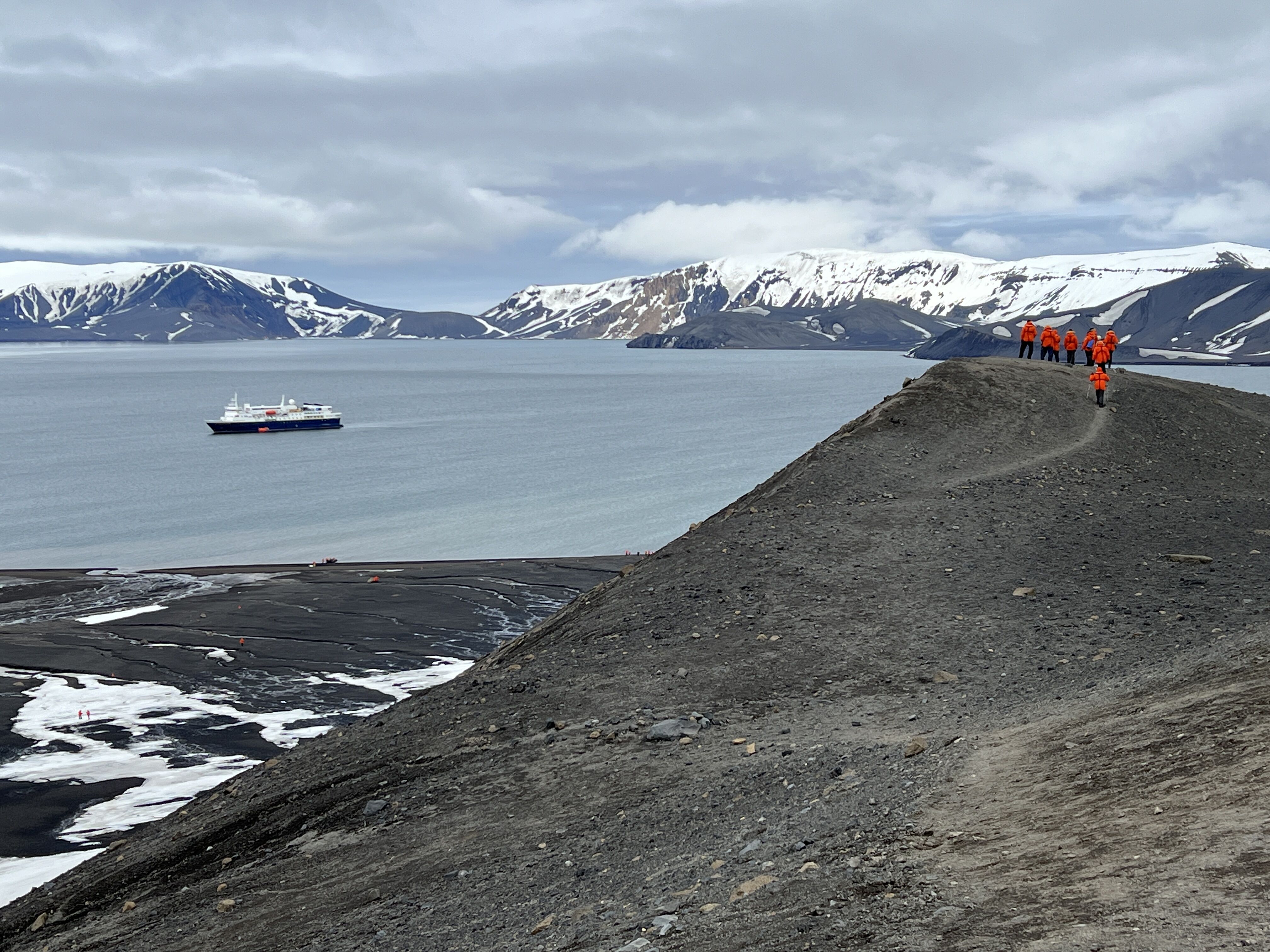 During lunch, the captain and the bridge officers relocated the ship deeper into Erebus and Terror Bay. When we arrived off the coast of Devil Island, the wind had completely subsided, and big snowflakes were falling. The options for the afternoon were kayaking or a hike to the top of Devil Island. Both were perfect choices. We returned to the ship after a beautiful afternoon, where the crew offered us the chance to take a polar plunge. A record number of us jumped in the freezing water, and we were rewarded with a super cool retro patch and a shot of an adult beverage!