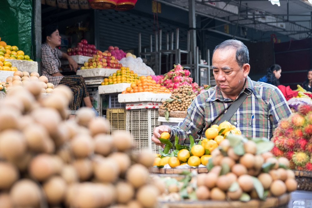 Following our trishaw rides, we had ample free time to explore a local market on foot. We fully immersed ourselves in the local culture as we meandered through stalls lined with fresh produce, meats and seafood. The colors, faces and action were a photographer’s dream. Dotted throughout the stalls were small cafes where the wonderful smell of local meals permeated the air. From the market, we once again boarded the longboats to visit a floating fish farm. Owners and workers welcomed us and explained how they catch, raise, feed and sell the fish to make a living.
