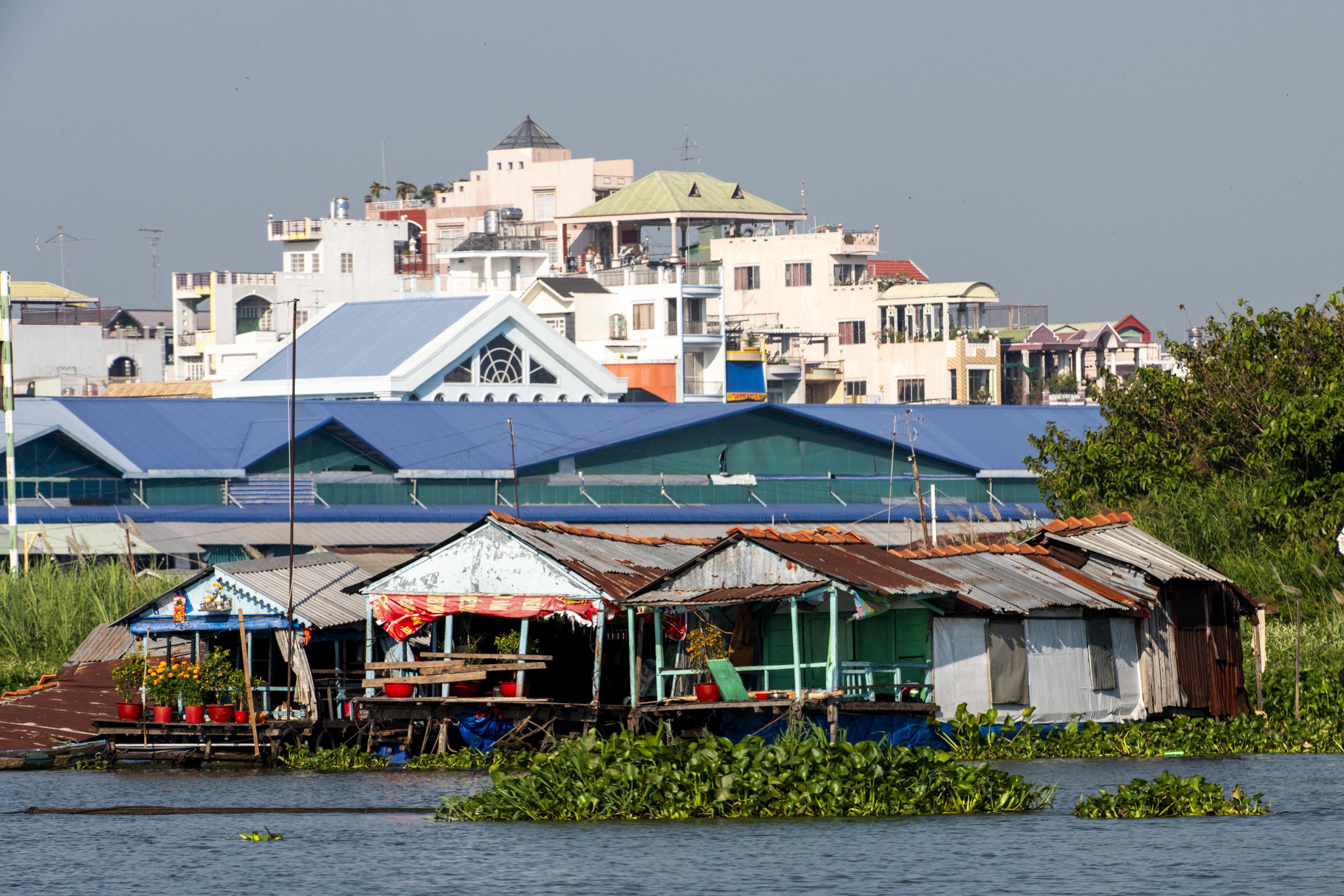 We awoke on board Jahan outside the town of Chau Doc near a colorful array of fish farms painted in rainbow hues. We boarded sampans (local boats) to go ashore in the bustling fishing port of Chau Doc. We explored the local market filled with fish, fruits, and fresh flowers. After a stroll through the market, we hopped on trishaws, the Chau Doc version of the cyclo, for a drive around town. Next, we boarded the sampans again to visit one of the local fish farms where they raise barb fish.