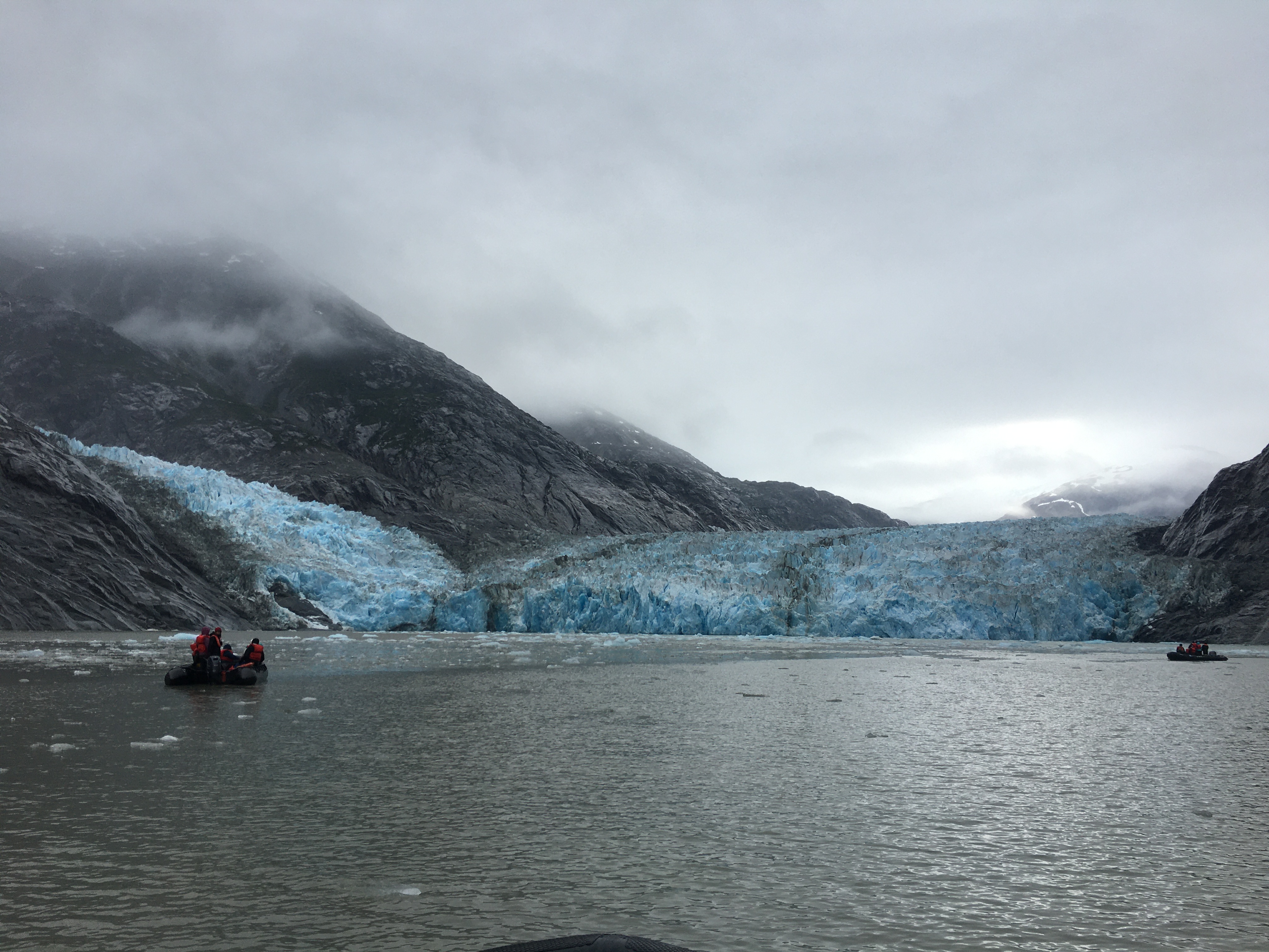 Our anticipation continued to grow as we watched glacial floes and bergy bits grow bigger and more numerous during the ship’s approach while we had our breakfast. And all of a sudden, we saw Dawes Glacier in the distance, majestic and climbing as far back into the mountains as the eye could see (and as far back as the rain and mist would allow us to see). Our intrepid explorers jumped into the boats to explore the front face of the glacier and were not disappointed. We saw spectacular blue colors, and pillars, and crevasses, and tried to guess how high those ice towers could be and imagined mountaineering across those landscapes. We listened to the thundering, and just as we held our breath after another thunder from the glacial face, a gigantic ice tower broke off, crashed into the water, and sent waves half a mile away that gave us a mini rollercoaster ride. After this incredibly beautiful tour in the morning, we had some brave souls who decided to jump in for a Polar Plunge! We salute them all for their icy courage!