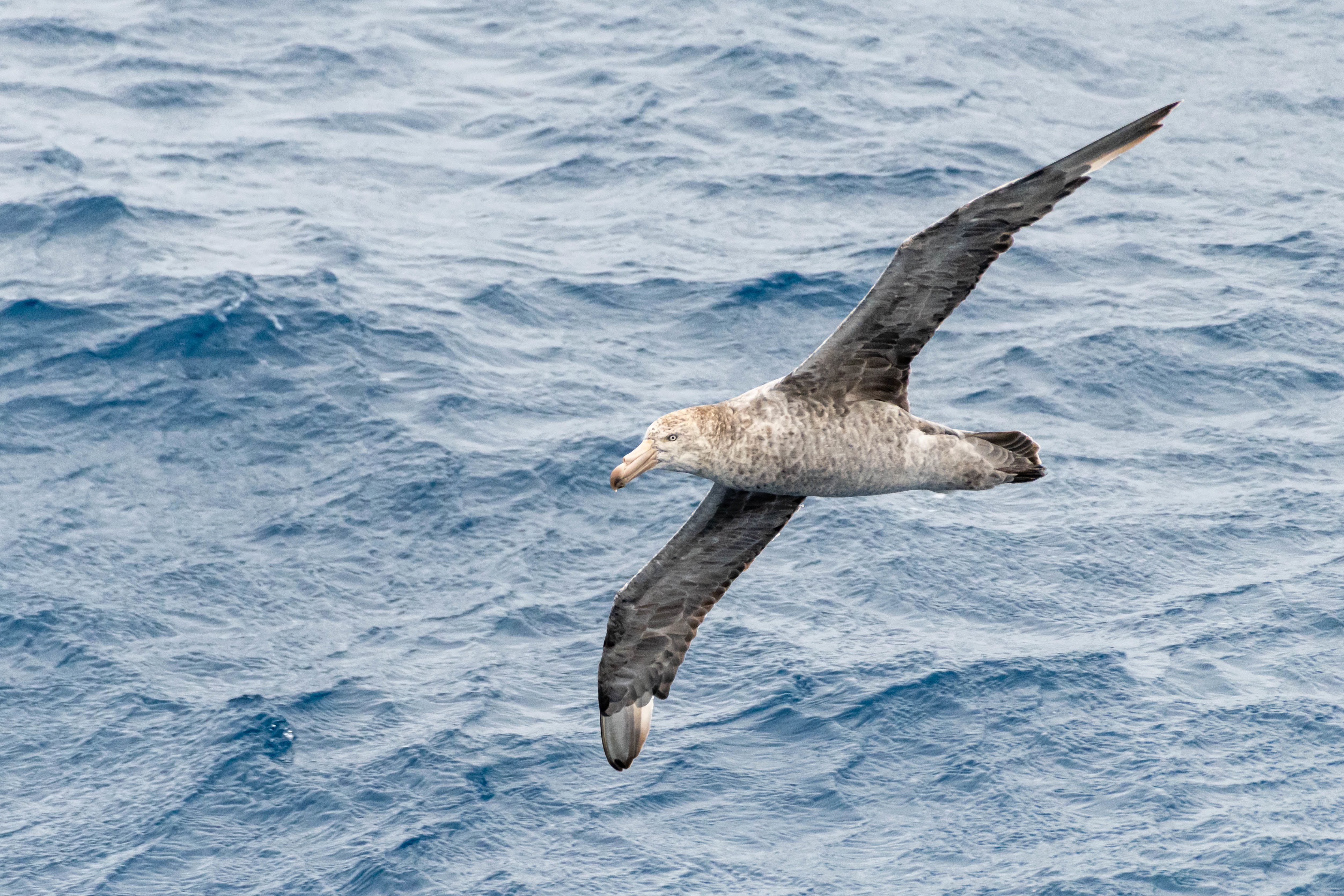 Strong winds made it the perfect day to spot the pelagic seabirds that call the Drake Passage and the Southern Ocean their home. Throughout the day, we watched birds soaring from the aft sundeck and outer decks. It was a great day for albatrosses, with a half dozen southern royal albatrosses following us at various points. We also spotted a juvenile wandering albatross and many black-browed albatrosses. The young wanderer came quite close, providing all on board with spectacular views of its size and agility. Along with albatrosses, we were greeted by many northern giant petrels, several white-chinned petrels, a blue petrel and both Antarctic and slender-billed prions. We even saw an albatross alight to find food. Giant petrels seeking an easy meal also saw this bird and quickly gave chase.