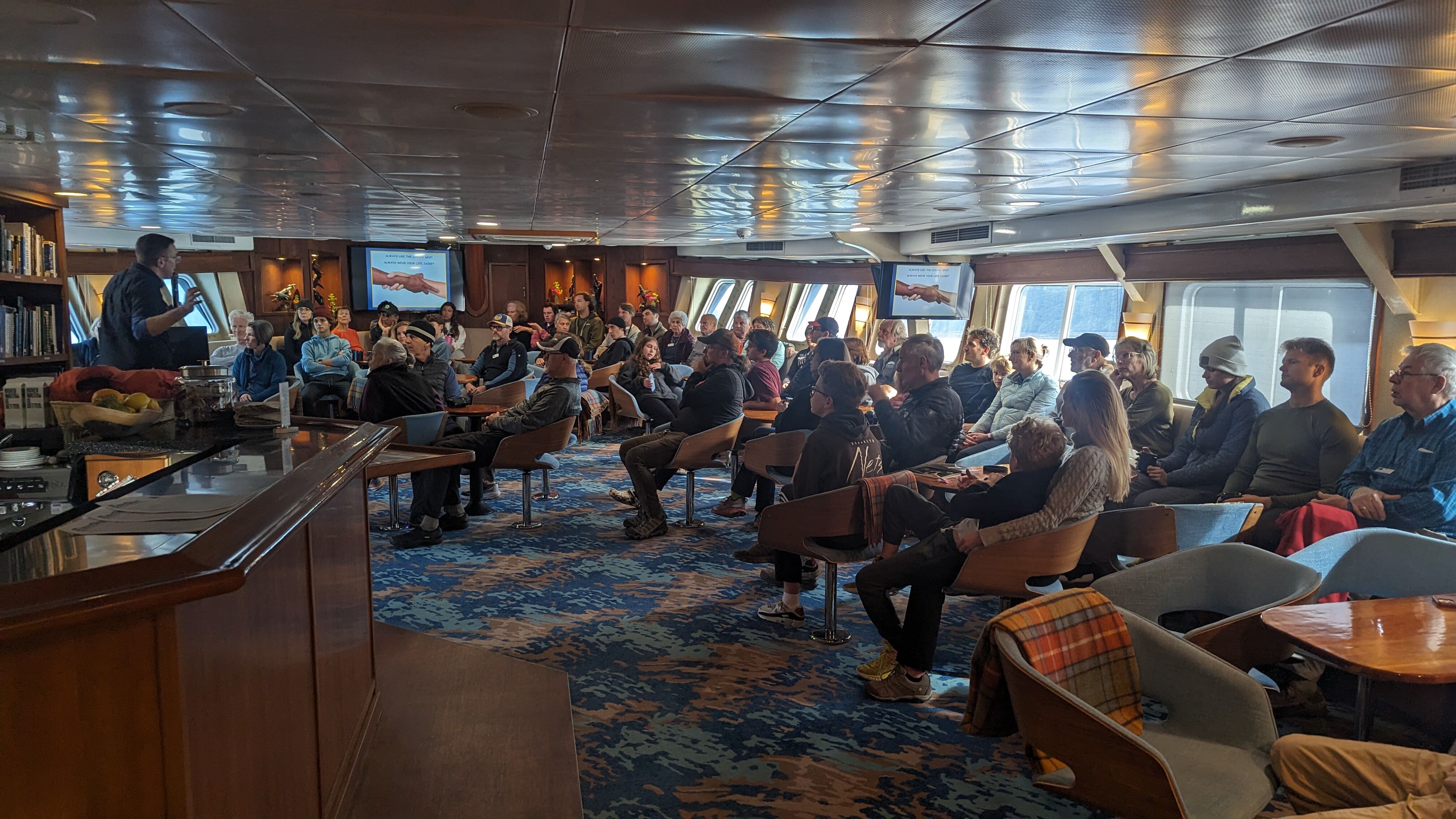 Today’s lunch was served on the deck to celebrate the good weather. It was amazing to sit in the sunshine and admire the surrounding landscape. But the day was far from being over. The afternoon offered more adventures with picturesque hikes on the grassy hills of Edinburgh Island. Compared to many of our previous landings, the tundra was lush and green. Some of the willows almost reached to our knees. Who could have imagined how our perspectives could change in such a short time? Something so small now felt rather big. We admired the lush vegetation, magnificent rock columns, and breathtaking views of the vast, open landscape. We returned to the ship tired but extremely happy.