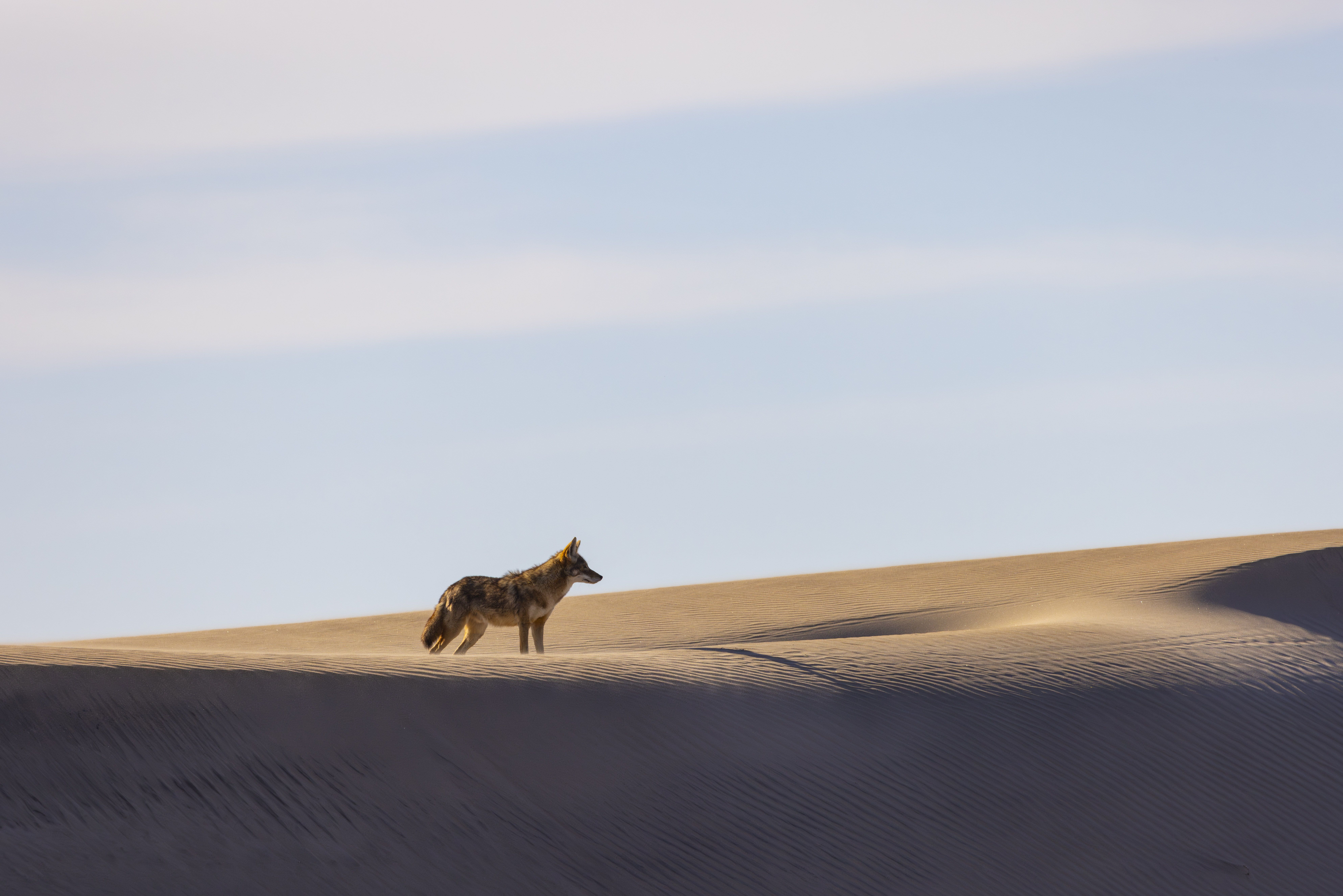 During lunch we traveled north through Hull Canal to Adolfo Lopez Mateos. We spent the repositioning watching birds and bottlenose dolphins from the bow. In the afternoon we set out in local pangas to go looking for gray whales. There were many whales at Boca de Soledad, and even a brand-new baby! Among other highlights were an abundance of birdlife and some coyotes on the sand dunes.