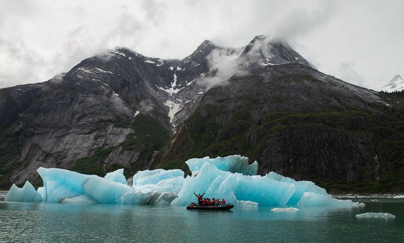 Every now and then, loud and low booms came from the direction of the glacier, reminding us to keep a long safe distance in case of large calvings and other hazards of the hard, dense glacial ice.  We admired and photographed the distinct and unforgettable blue color of the ice, that seemed at times to glow from within the beautifully sculpted icebergs.  Along the way, numerous small heads would appear above the water, curious harbor seals, and a few guests spied the elusive harbor porpoise as well.  A chilling breeze blew down off the glacier. At an unexpected moment, a boat of marauding Vikings appeared, or were they pirates? or perhaps Pirate Vikings?  This was the motley crew of the National Geographic Sea Lion’s “Cocoa Boat,” speeding through the icy waters to bring needed hot chocolate with whipped cream to the chilled Lindblad National Geographic guests.