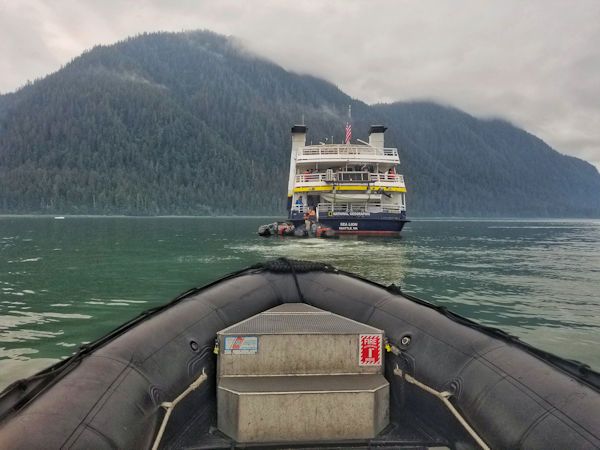 On the last full day of our voyage, we woke in Endicott Arm near the Dawes Glacier. We spent the morning enjoying Zodiac tours to the face of Dawes Glacier and watched multiple calving events. We were also able to spot several harbor seals, waterfalls, and a couple harbor porpoises on the way. After lunch we had the opportunity to participate in a polar plunge. Forty people decided to brave the frigid water for a short swim. Those of us not eager to jump into glacier water were able to watch from the bow. After the polar plunge, we warmed up on board as we started transiting towards Juneau. On the way, we stopped at a beautiful waterfall to once again admire the amazing natural beauty of Alaska. During our farewell recap, we were treated to a quick visit by a humpback whale. We ended our day with a slideshow made up of our favorite photos and memories of an amazing week on board National Geographic Quest .