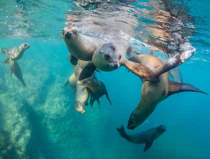 Our day was far from finished. After we returned to our ship, the National Geographic Endeavour moved across Bolivar Canal towards Punta Vicente Roca. On the way, Cindy’s keen eyes spotted a sperm whale and some common dolphins, who escorted us for a short time, and as soon we arrived to our next destination, our guests were ready to snorkel. The crystal clear blue waters and gorgeous landscape delighted us as we explored the ocean, observing sea turtles, penguins, fur seals. There was a curious flightless cormorant that approached us as well, trying to figure out if we were edible or not!
