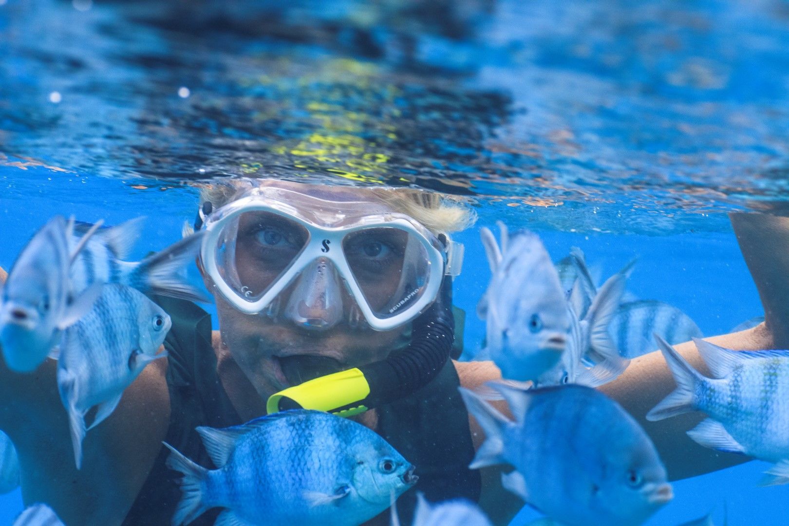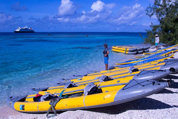 Our expedition stop today lacked the desperation of Magellan’s visit so long ago, but we were no less excited to be here. We devoted the morning to activities in the gin-clear waters…SCUBA diving, snorkeling, and tours in the glass-bottom Zodiac. The upper-most region of the reef appears to have suffered from coral bleaching in the last couple years, because most of the short finger coral structures were coated with calcareous algae. However, from a few meters lower, the rest of the coral reef located on the slope is very healthy, with near total coral coverage dominated by platelet corals. The most common fishes in the shallows were black trigger fishes and various dark-colored surgeon fishes, but deeper waters held numerous larger predators, such as snappers, trevally jacks, and at least three species of sharks (blacktip reef sharks, whitetip reef sharks, and grey reef sharks). It is noteworthy that the species diversity of both corals and fishes have definitely decreased as we have gotten more remote and isolated from where we began this voyage in the Tuamotus of French Polynesia, but that is to be expected as demonstrated by the study of biogeography.