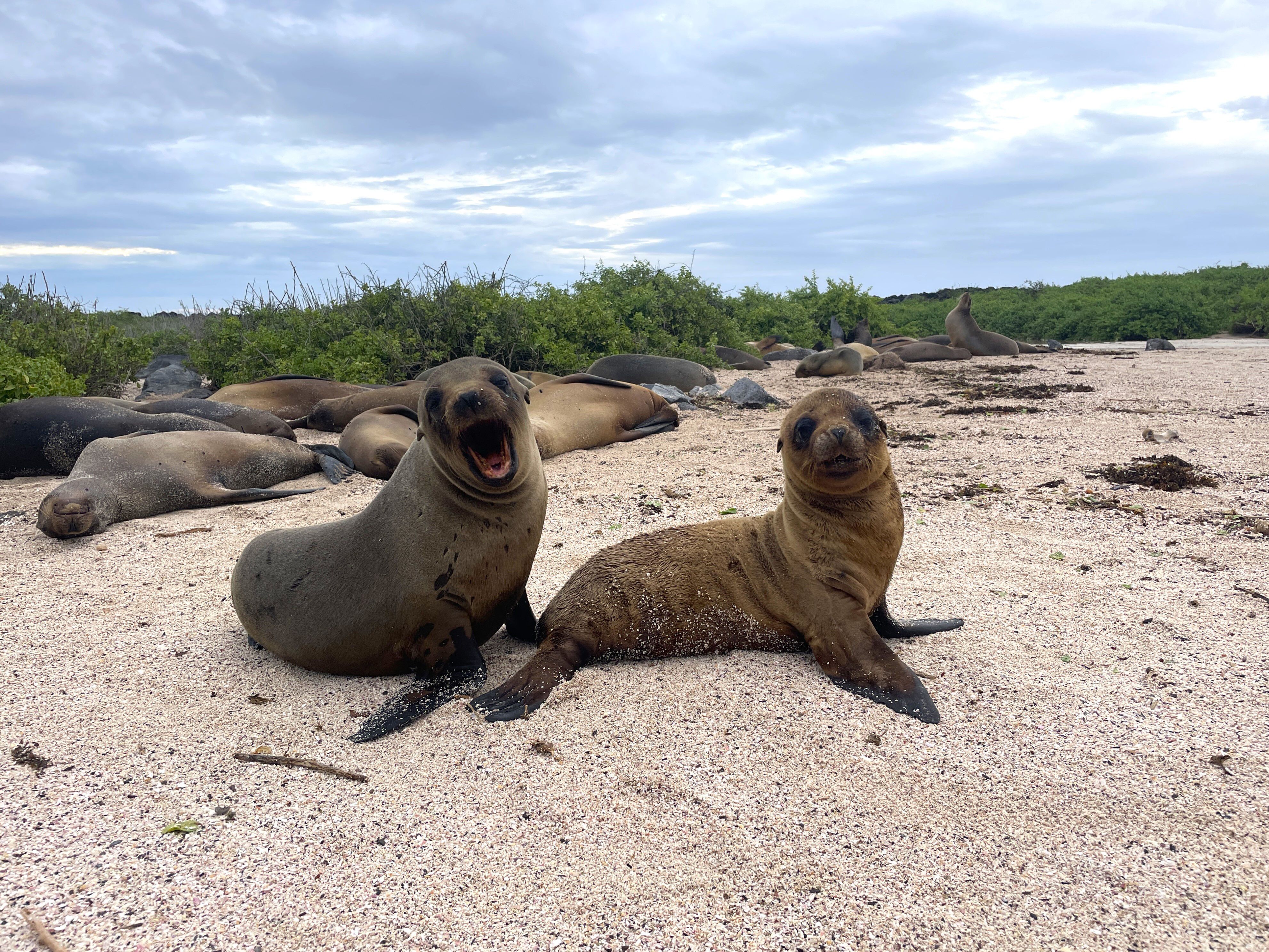 In the morning, we started our activities at Punta Cormorant. We took a relaxed walk near a brackish water lagoon, where we found Galapagos flamingos. This beautiful area is surrounded by dry vegetation. The trail led us to a wonderful white sand beach, where we observed green sea turtles and their nests.