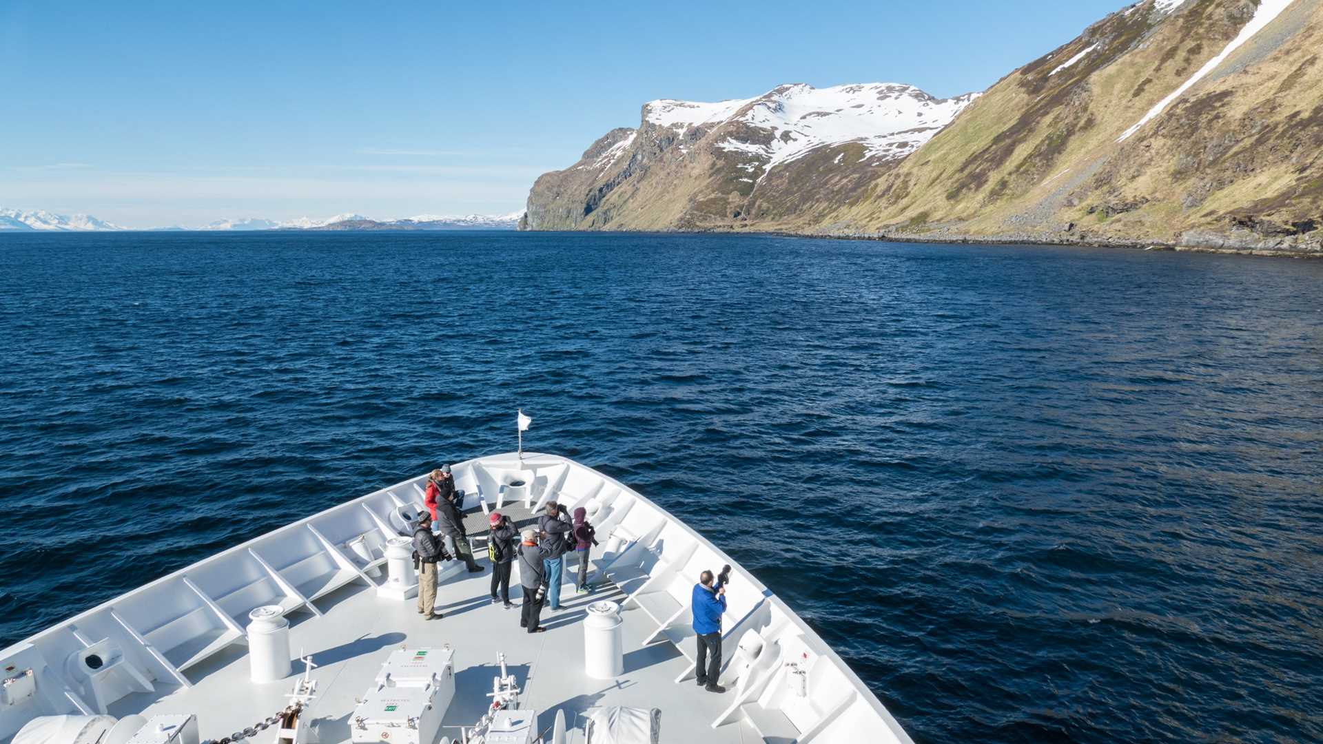 We woke to a clear sky and a warm sun beating down upon us. Though the National Geographic Orion was still well above the Arctic Circle on its way toward mainland Norway, the weather seemed not to notice. Our day of exploration began as we arrived at Fugløya island, where we witnessed hundreds of puffins dashing about the sky. Even higher up upon the cliff were half a dozen white-tailed eagles in search of a meal.
