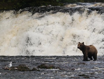 We were delighted to have William aboard for the day, for witnessing the parade of wildlife. It was easy for us all to feel the spiritual nature of Glacier Bay. It started with South Marble Island, where hundreds of Steller sea lions postured and growled, and seabirds perched on every inch of rock that was shy of vertical. Gloomy Knob, though earning its name with tendrils of fog across its face, was clear enough for the group to spot mountain goats foraging on the steep granite, far from predators in the safety of the mountains. Or so we thought, until, circling around the far side of Gloomy, we encountered a mother brown bear traversing the cliffs with her three cubs-of-the-year. Murmurs came from the gathered crowd on-deck: “So steep!” “That’s quite a climb to find some berries.” “She deserves a standing ovation if she gets all three of those cubs to the top!”