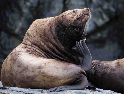 As we approached our first wildlife hotspot, we heard low growls of northern sea lions and saw their brown bodies slowly writhing between each other or lying side-by-side like carefully placed logs. They had hauled out on the first of a series of progressively larger marble islands. These were once coral atolls around volcanic islands transported here from equatorial places by the geologic forces of plate tectonics. That started over 400 million years ago, long before the sea lion growls drifted through the air. Today hundreds of kittiwakes, gulls, guillemots, murres, and cormorants covered these islands. Yellow sprigs of feathers ridiculously large and colorful bills decorated the heads of the endearing puffins. High-pitched barking took us all by surprise, because it came from a California sea lion. They are occasionally found here but are far from their more southern range.