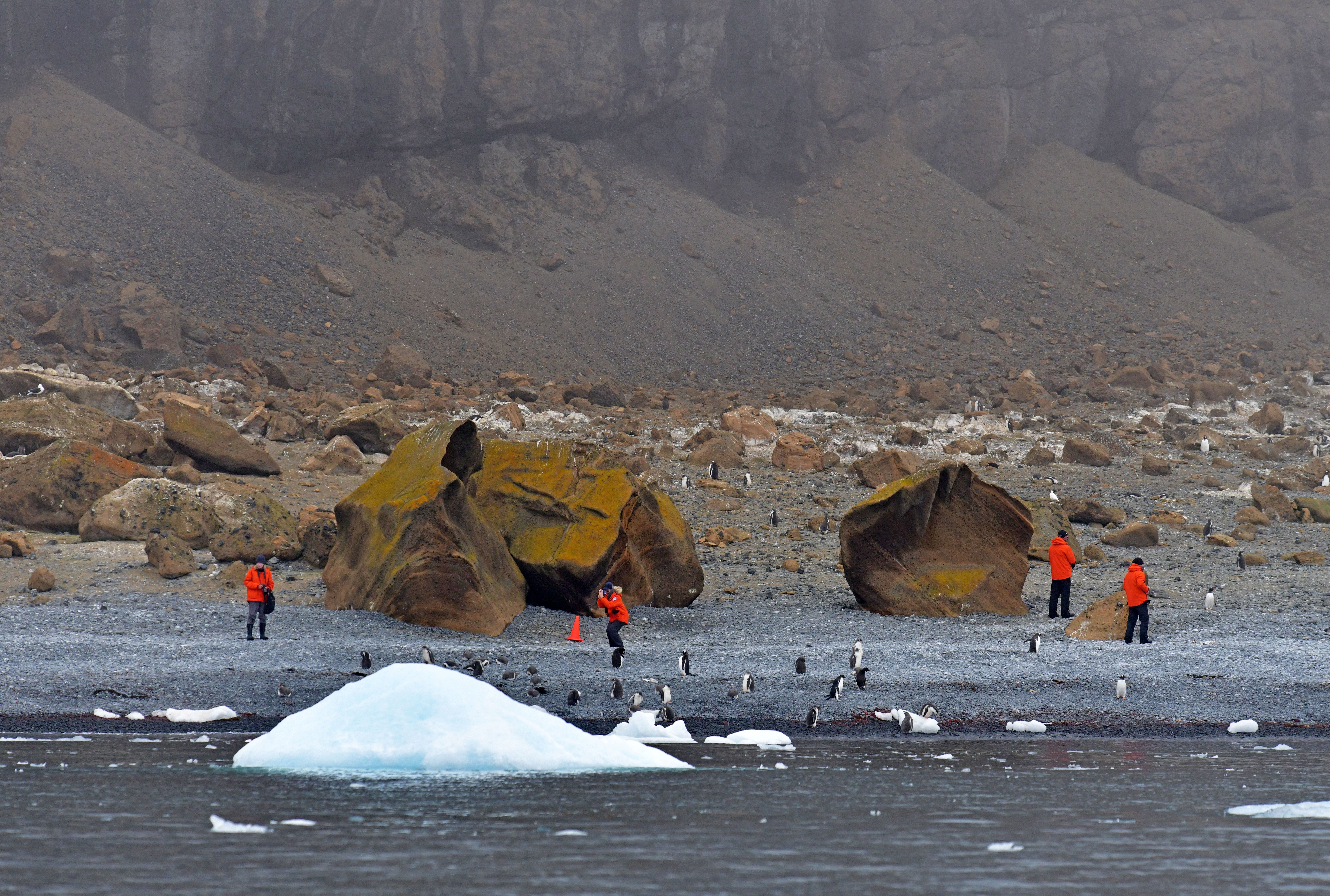 After lunch, we were ready for a landing at Brown Bluff on the western side of the Antarctic Sound. This continental site holds a large colony of Adelie penguins and a small amount of gentoos. With its beautiful volcanic rock formations, Brown Bluff is also a very special spot for geologists. The landing was initially enveloped in a bit of fog, but the weather gradually cleared into sunny skies. We were delighted to see so many chicks of Adelies as well as gentoos. We are fortunate that we have seen all three brush-tailed penguins that breed in Antarctica on this expedition: gentoo, chinstrap and Adélie penguins.