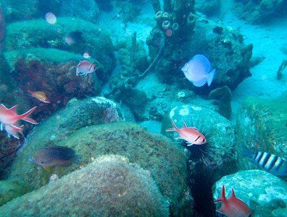 During breakfast we heard the anchor being dropped. We had finally arrived. As soon as possible we ran to our rooms to grab our gear and head to the fantail. Our eyes couldn’t believe what they were seeing. We had anchored next to a little islet, very similar to the one in Gary Larson’s comic, “The Far Side.” This islet is known as “little bullion of gold,” Granito de Oro.