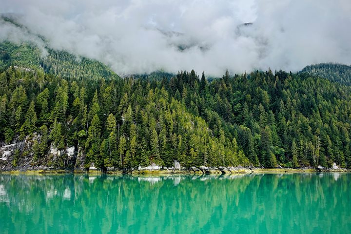 The afternoon was hot and sunny, and we took advantage of the stunning weather to offer a bushwhack up the mountain or a Zodiac ride in the scenic fjord. The bushwhackers set out using whatever means necessary to move up and down within the temperate rainforest. Each Zodiac made its way around the fjord looking at the majestic scenery and for wildlife. Guests saw seals, common mergansers, and gulls. A couple lucky groups saw some river otters.