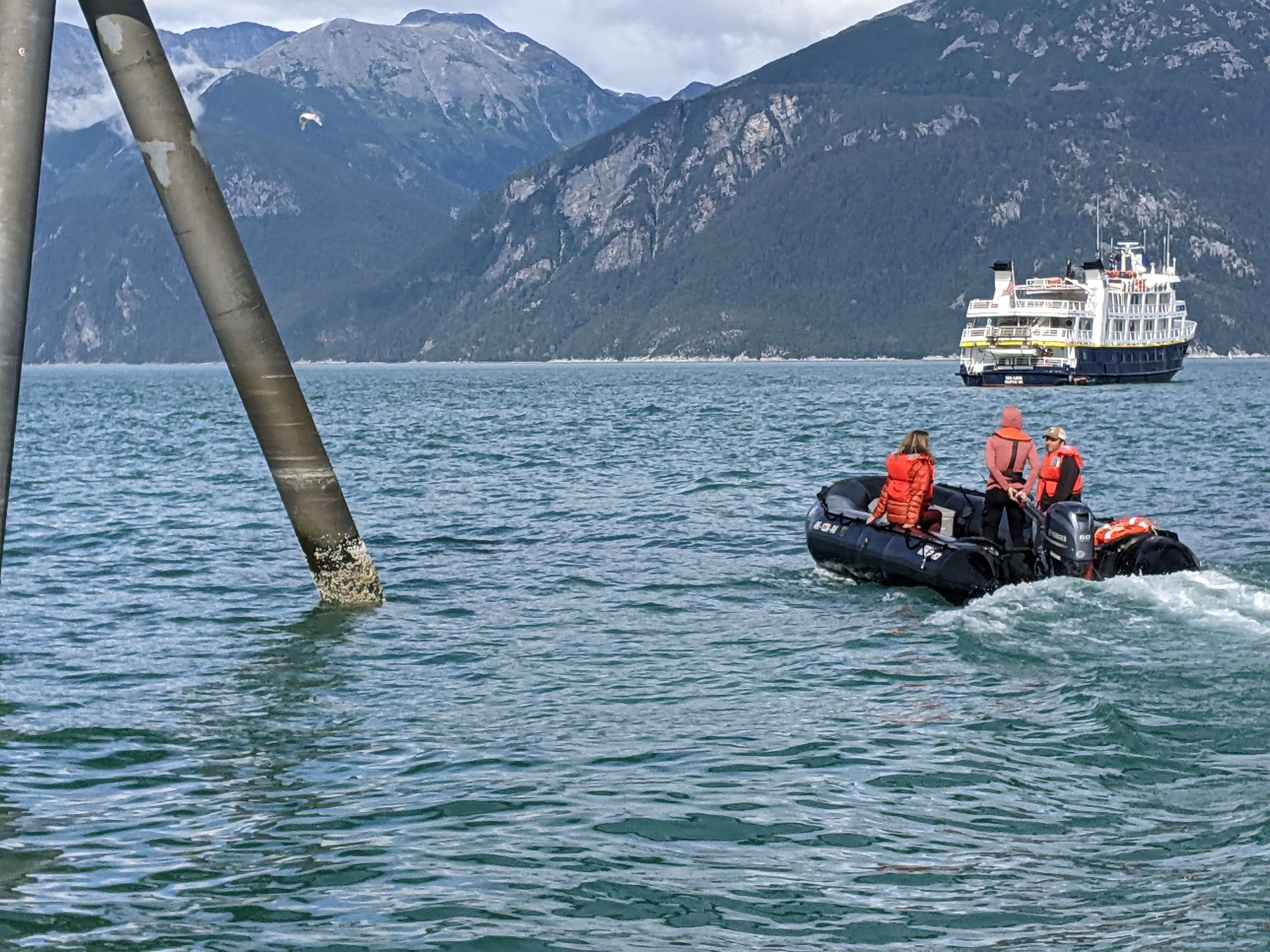 It is always a pleasure to surprise our guests. With such great weather, we were able to cook up a doozy. Upon arrival back to the ship, guests were invited to the sundeck where our hotel staff had set up an outdoor happy hour to allow them to bask in the sunshine and beauty of Haines from the water. Cell phones and cameras were passed around as we all shared stories and photos of our day over drinks. Guests were amazed at the beauty of observing moving glaciers from above. Many never even imagined they might do such a thing. The bicyclers had to stop in their tracks to watch a mother bear and two cubs pass just a few yards in front of them. Don caught a huge pink salmon that pulled him into the stream, causing him to show up to the ship soaking wet and grinning ear to ear.