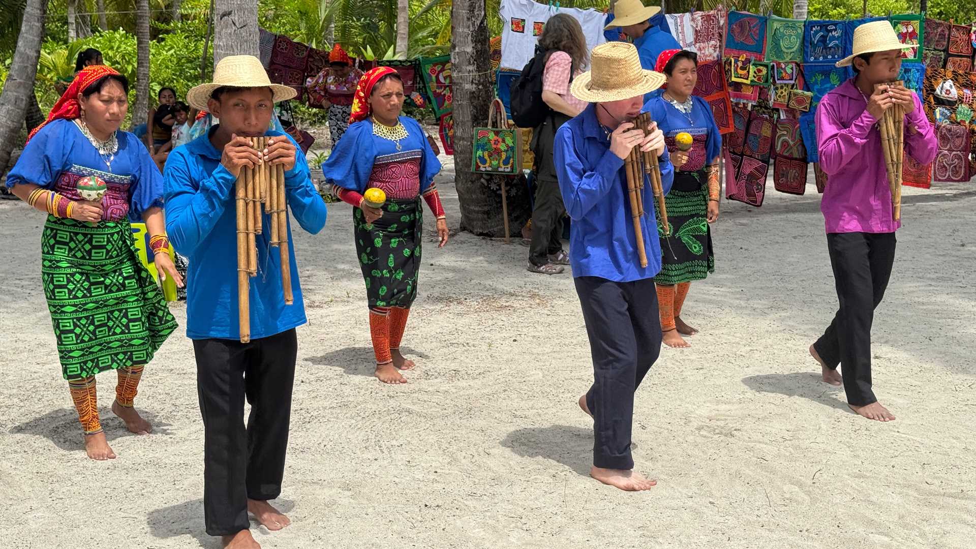 When we finally arrived, a lovely white-sand island surrounded by turquoise water invited us to disembark and explore. Local Guna people shared traditional music and dance performances. Our guests had the opportunity to visit each mola artist and learn about the meaning of the handcrafted textiles.