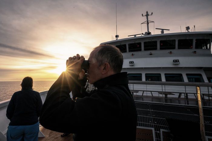 Lindblad ships sail an officially non-navigable channel, the Hull Canal, from south to north and north to south, to search for mother whales and their calves, for adults in breeding behaviour, and to share a piece of ocean and skies with these giants of the sea—gray whales.