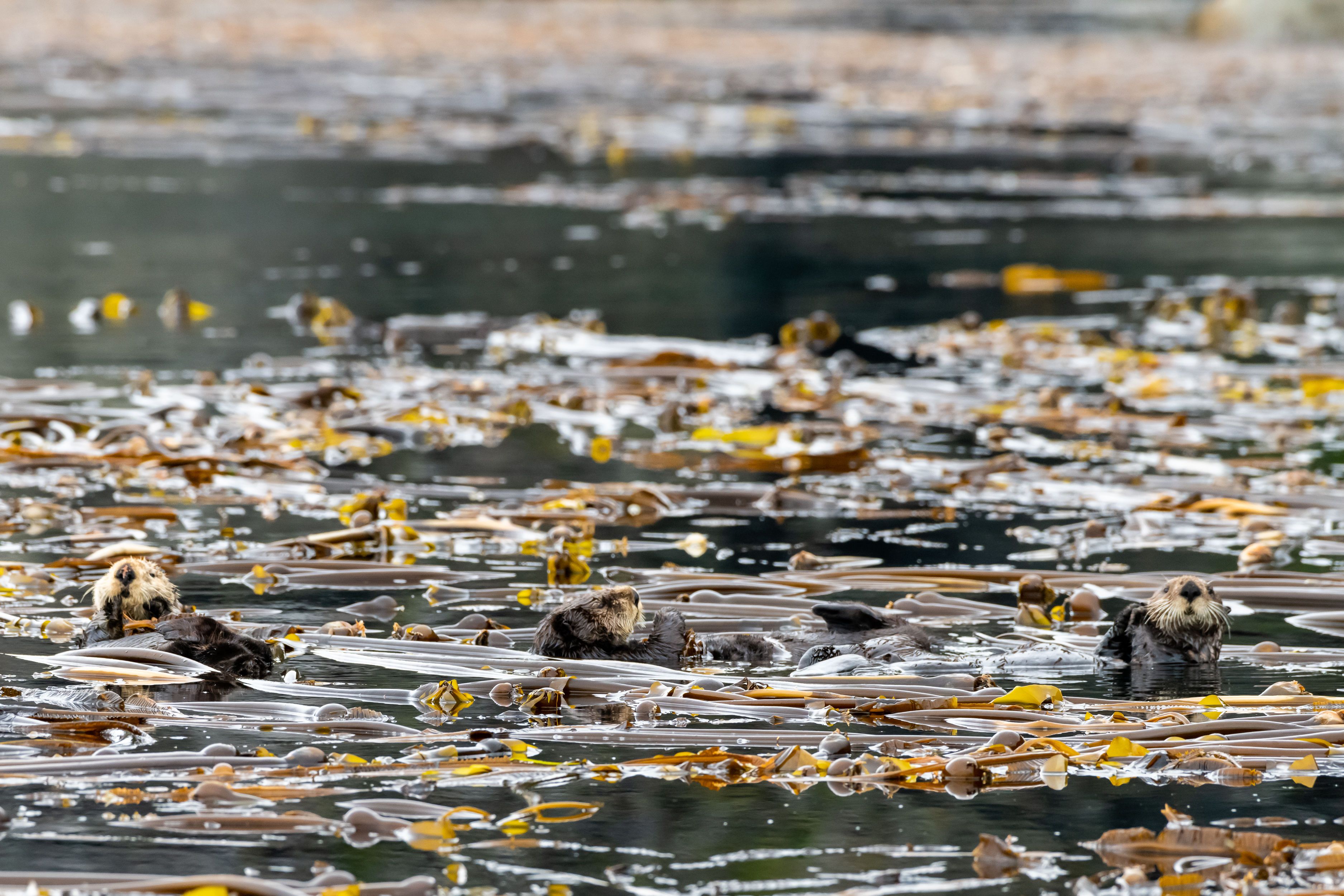 Tufted puffins flew around our heads and pigeon guillemots called out to one another, drawing our attention from the otters. Soon there were Steller sea lions swimming all around our boats—cavorting, snorting, hunting, playing in the currents that swirl through the islands, and bringing fish close to the surface for the sea lions.