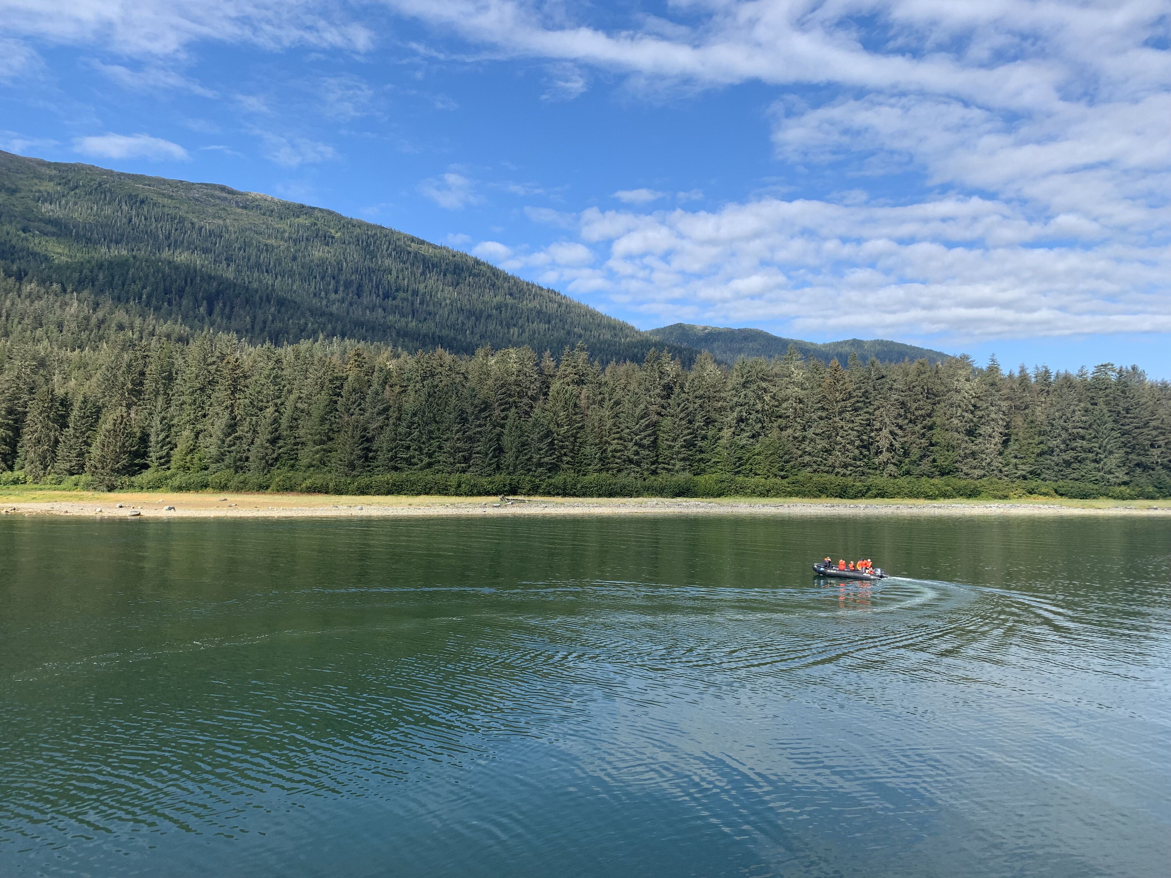 Today, we embarked on a voyage through the breathtaking Endicott Arm, a 30-mile fjord carved by ancient glaciers. As our vessel glided through the jade-green waters, towering granite cliffs rose on either side, with cascading waterfalls fed by melting snowfields. The fjord's serene beauty was punctuated by the occasional splash of harbor seals diving from ice bergs and the distant sight of mountain goats navigating the rugged terrain. Approaching the terminus of the fjord, the awe-inspiring Dawes Glacier came into view. Standing over 500 feet tall and half a mile wide, its icy facade shimmered in hues of blue and white. We boarded Zodiacs to get a closer look, maneuvering through a maze of icebergs, each uniquely sculpted by nature. Suddenly, a thunderous crack echoed as a massive chunk of ice calved from the glacier, crashing into the water below and sending ripples across the fjord—a humbling reminder of nature's power. The journey through Endicott Arm was more than a scenic cruise, it was an intimate encounter with the raw, dynamic forces that shape Alaska's wilderness. The memories of shimmering glaciers, playful seals, and towering cliffs will linger, a testament to the allure of this pristine frontier.
