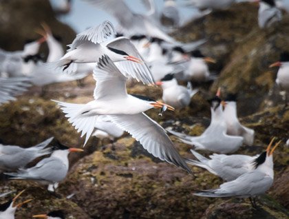 Many of us woke up early this morning to try to find some marine life from the sundeck while we circumnavigated the northern side of Isabela (the sea horse shaped Island). The titans, known as Ecuador and Wolf volcanoes, looked spectacular with colorful lava fields decorated with a yellowish color, harmonizing with the sky on this beautiful morning. After breakfast the ship crossed the equator line, so we celebrated with a special ceremony. As soon we dropped anchor at Punta Vicente Roca we headed out on a Zodiac ride along the coast of Isabela to observe several geological features which are evidence of previous eruptions which occurred long ago. We saw long lines of black lava and blue footed boobies and frigate birds who were looking for food. The sun appeared and warmed up this location and marine iguanas did not lose time to start swimming and trying to eat some seaweed. They were accompanied by some Galapagos penguins which swam as fast as torpedoes and fed on small black striped Salemas. We also spotted flightless Cormorants feeding underwater. We headed back to the National Geographic Islander so our guests could get ready for the snorkeling activity. Our explorers found different species of fish, but probably the most interesting and abundant creatures of all were the green turtles. Of course, Galapagos penguins and flightless cormorants delighted our guests who enjoyed swimming with incredible creatures like nowhere else in the world.