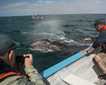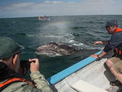 The ship relocated to Isla San Pedro Mártir for the afternoon. We cruised along the shoreline of this isolated island with our inflatable boats to see the brightly colored geologic formations, abundant seabirds, and marine mammals. Rafts of hundreds of eared grebes dove in unison and then reappeared almost simultaneously. A rat eradication effort seems to have resulted in increasing numbers of red-billed tropicbirds each year. Many of these elegant birds with long, streamer tails flew over our boats along with blue-footed and brown boobies. Curious young sea lions porpoised beside some of our boats. A real thrill for those in several boats was a water-level view of bottlenose dolphins bow-riding and leaping in wild jumps as we motored along with them.