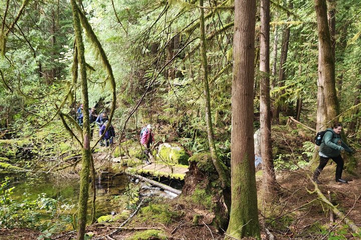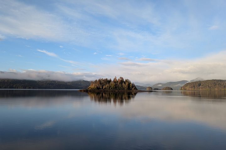 After an evening cruising from SG̱ang Gwaay, National Geographic Sea Bird made one last stop this morning in Daajing Giids to drop off our cultural interpreters, DeeDee Crosby and Grace Garvie. At dock, we had two unique opportunities. The first, our daily morning stretch class had the opportunity to meet on land, and second, we welcomed the incredible artisan, Aay Aay, aboard. We were familiar with Aay Aay, who we had met two days prior as an interpreter at the Haida Heritage Center. His specialty is a revival of traditional Haida weaving. During Aay Aay’s time on board, he shared with us his personal story about discovering and mastering his art with spruce root, cedar, and wool weaving. He taught us how to hand spin the warp threads that would be the beginnings of a wool piece. After an artistic morning, we embarked on our journey across Hecate Strait to reach our next destination along our expedition, Alaska. This evening, I write as we make our way into Dixon Entrance preparing to wake up to the scenery of the famed Misty Fjords in the morning.