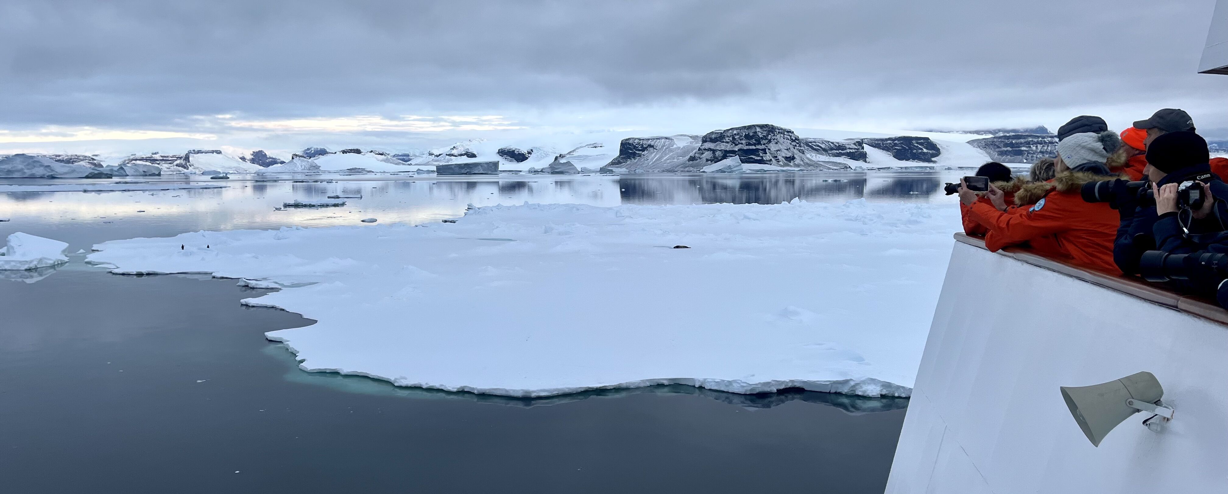 The intention was to begin the day with a landing to observe the unique geology of James Ross Island, an area with one of the highest accessible concentrations of fossils on the western Antarctic Peninsula. Instead, we were awoken in the early hours of the morning by an announcement that two emperor penguins were spotted en route. We quietly observed these recently fledged juveniles on a patch of sea ice floating on a serene surface. We were surrounded by their reflections, icebergs, and an endless horizon of snowcapped mountains in the distance.