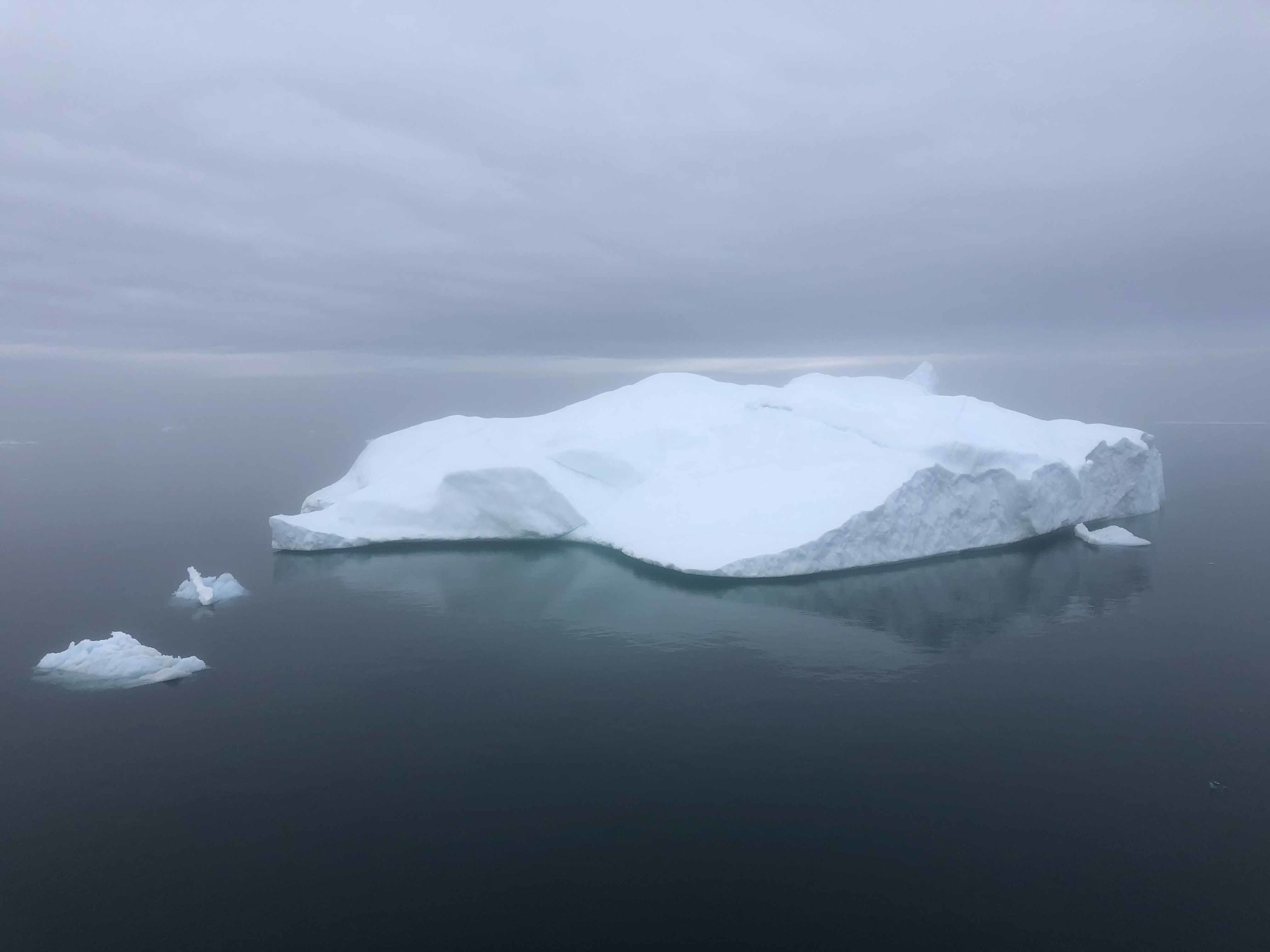 The fog required us to proceed at a jellyfish’s pace and often necessitated stopping and holding ground. By mid-morning, we were forced to leave Kangerdlugssauq for Ryberg Fjord, halfway back to Nanson Fjord. We were constantly teased by brief periods of sun. Being grounded by fog, however, allowed us to attend presentations on polar bears and sea ice.