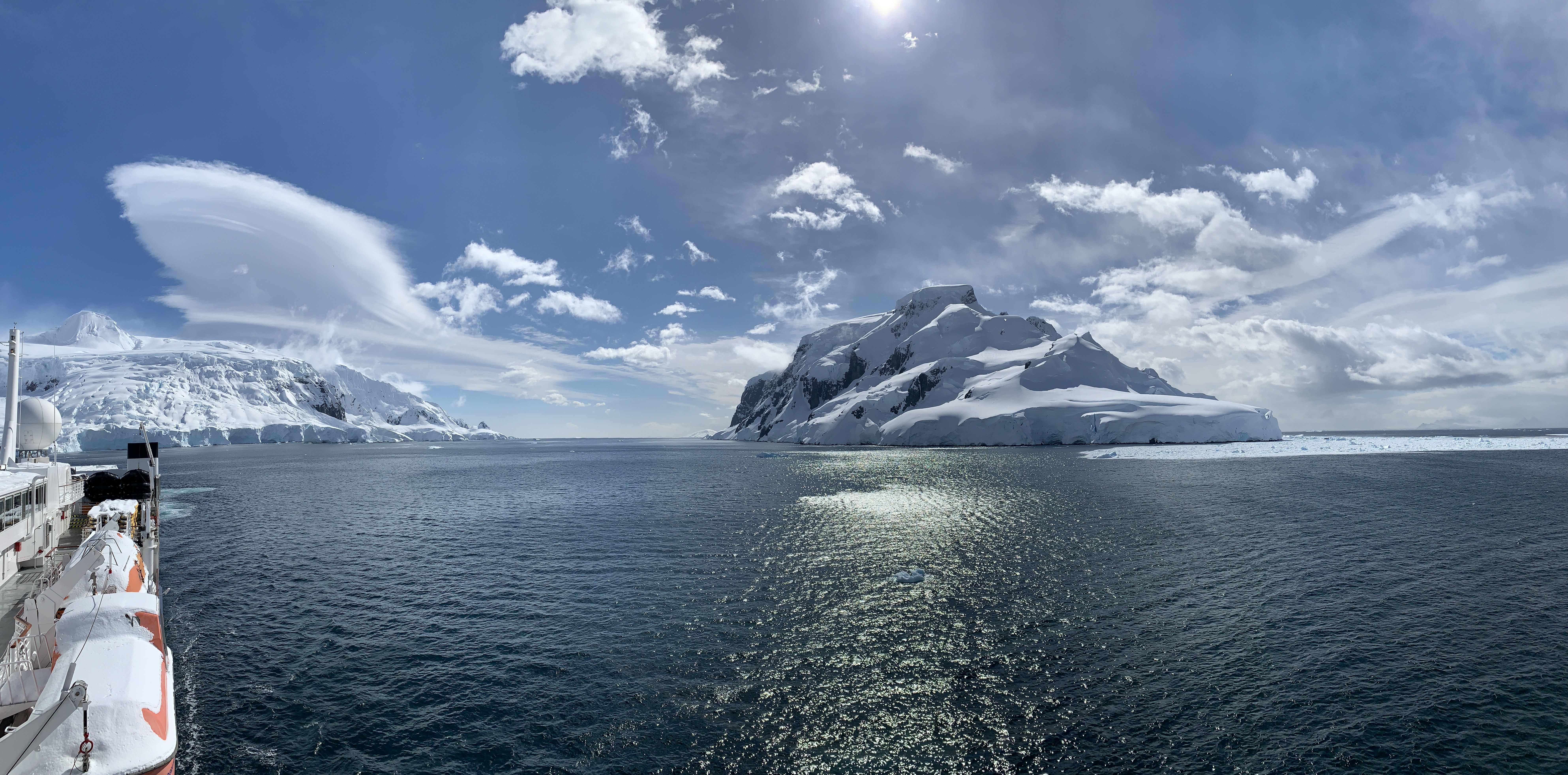 After a windy afternoon and evening yesterday, we continued the search for calm seas. Our morning navigation along the eastern coast of Brabant Island yielded some calm patches from which to observe the gorgeous glaciers all around us. In Kayak Bay, we thought we might have found conditions that would allow for an off-the-ship activity, but the gusts were simply too strong. We settled for a morning of exploration by ship. We passed several humpback whales, many gorgeous icebergs, and enjoyed the sunshine as it lit up the mountainsides all around us.