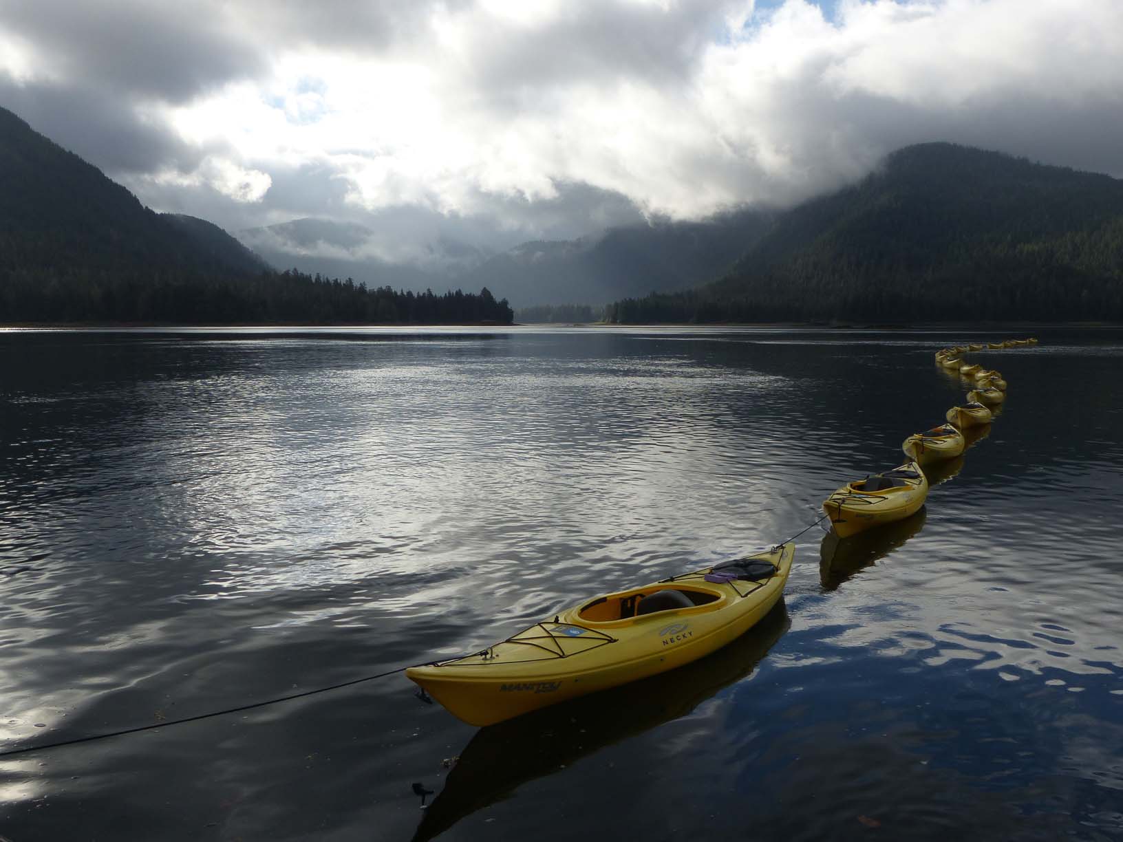 After a morning full of activities, we sailed around the northeast corner of Baranoff Island and entered Peril Strait to get to Lake Eva; we all went ashore and engaged in different types of hikes, from aerobic to moderate and photo walks. Lake Eva’s trail was created by the Forest Service and is a pleasure to hike; wide and with layer of gravel, it is easy on our feet and allowed us to admire the forest around us instead of worrying about our footing. Lots of bear poop and other signs, like chewed-up wood posts, reminded us that we are in bear country. Brown bear country! At a small and picturesque pond we watched numerous creatures in the shallow water including pink, chum, and sockeye salmon, plus cutthroat trout and Dolly Varden char; I got in the water to drop a couple of weighted cameras to get some footage with a unique fish’s point of view. The abundance of fish reminded us that the health and lush aspect of the forest is in direct relationship with all the nitrogen, phosphorous, and other nutrients that the salmon bring back from the ocean. A wonderful relationship between the forest and the sea, made possible by a remarkable fish.