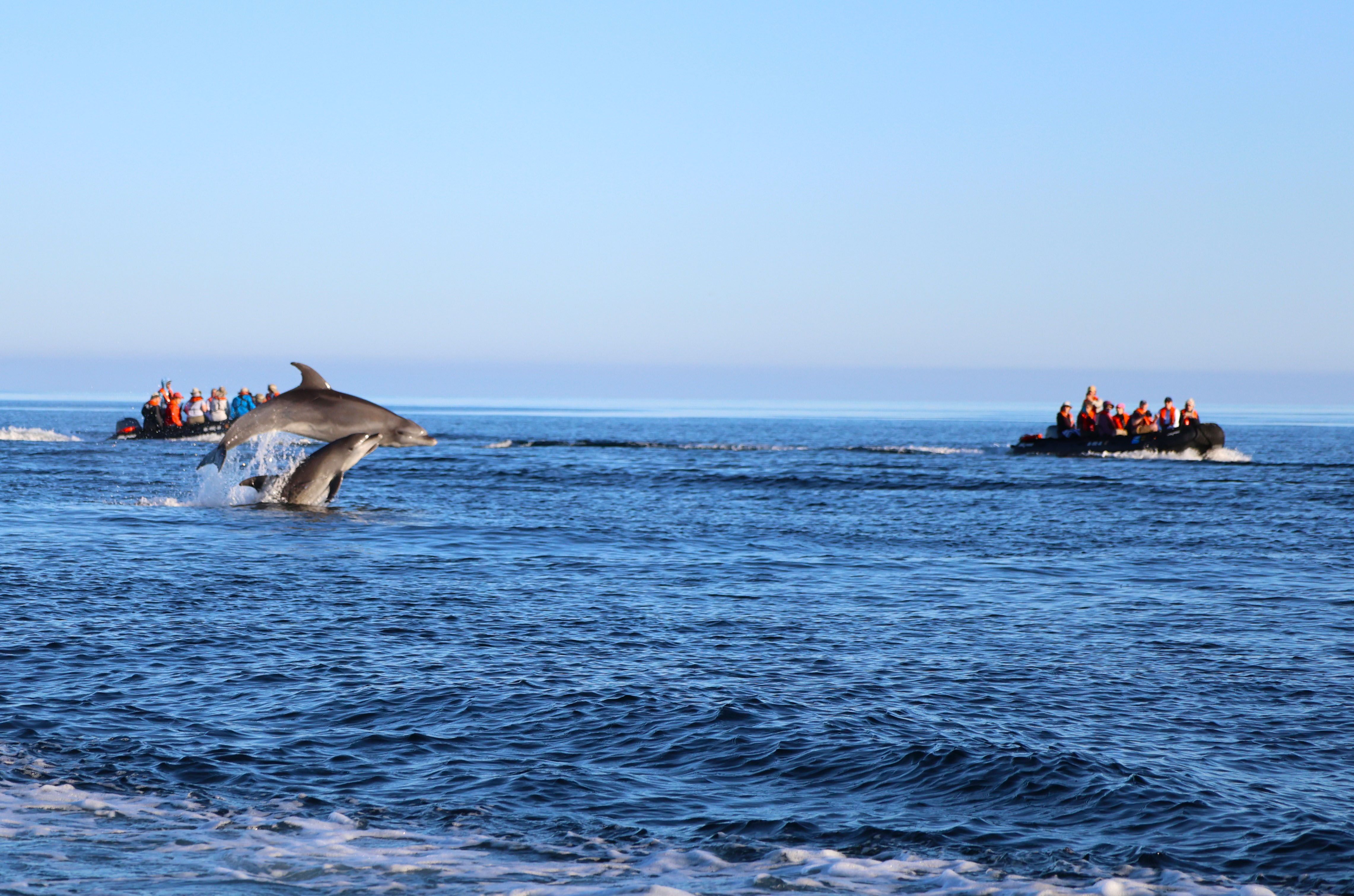 National Geographic Venture awoke to an encapsulated bubble around us. Most of the morning was spent going in and out of fog, but just before lunch it lifted to reveal a glorious look at common dolphins, hundreds of them. Cameras clicked and whirred as we spent the late morning in the presence of these magnificent cetaceans!