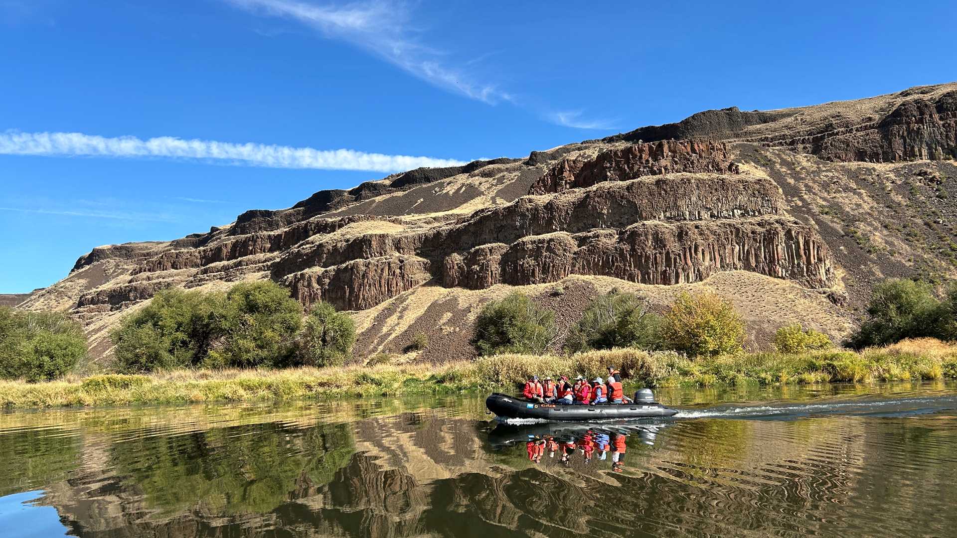 This cruise is one of the natural history staff’s favorite operations of the trip. Along the banks, great blue herons wade while dragonflies hunt the bevy of insects that skim the vegetation-covered shoreline. Above these creatures belted kingfishers and red-tailed hawks fill the air with a chorus of shrieks and rattles. This grand, natural spectacle takes place against a phenomenal backdrop of the basaltic hills of the channeled scablands.
