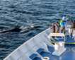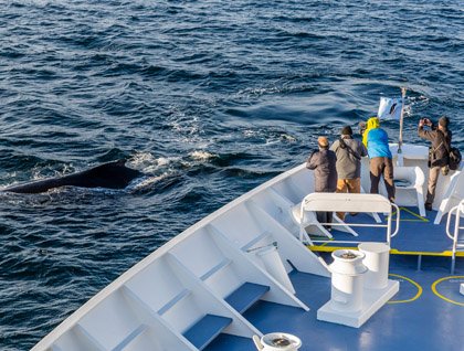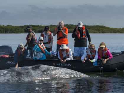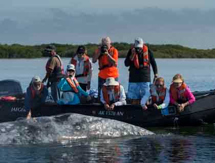 Sunrise at Magdalena Bay, we have been looking forward to this morning since the beginning of the expedition. All week we have been learning about this desert, where cactus tower above us, sea lions frolic with us as we swim beside them, and blue whales feed in the depths beneath us. Now, however, we are in the domain of the gray whales. This will be the first time we will be observing whales from the vantage point of our inflatable boats. Watching from the deck of the National Geographic Sea Bird is a wonderful experience, but being at the surface of the water in which the whales live, is an altogether different thing. Other than actually swimming with them, this is the most intimate way to observe whales.