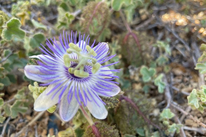 Walks in the desert can hold a plethora of surprises, and today was no exception. From clusters of scarlet Palo Adan flowers, the gems of the morning, to purple and white striped passion flowers. The numerous fruits on the vine attested to a series of flowers earlier this month. A diminutive bird, the verdin, was also interested in the Palo Adan flowers. The verdin’s short beak cannot reach the nectar, so this bird approaches the base of the flower, nips it open, and takes a nectar reward; pollination of the flower is thwarted in this thievery. The exoskeleton of a tarantula was found under the scrub, an indication of a spider that has molted and grown a bit bigger. At the end of the trail, we were all rewarded with a magnificent view of the Pacific Ocean. Good things come to those who venture outdoors.