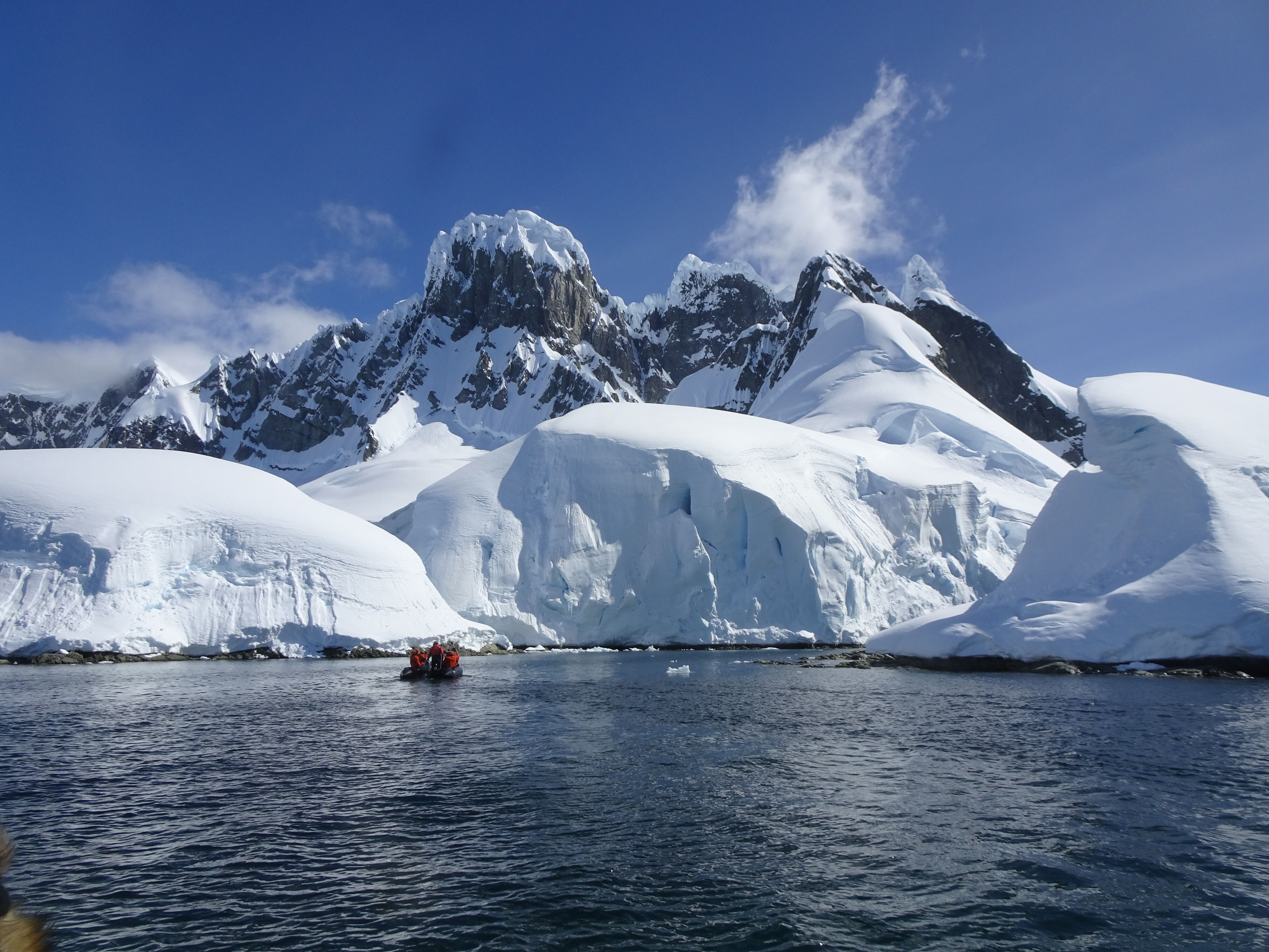 We’ve had a bright and beautiful day, well south of the Antarctic Circle at 67° 33’ south latitude. This morning, we explored Bongrain Point on Pourquoi Pas Island, where Adelie penguins waddled their way between nests and the sea. Meanwhile, many of us hiked the lateral moraine alongside the glacier. From the top, we enjoyed great views of Marguerite Bay. In the afternoon, we arrived to a rarely visited bay, with stunning scenery and glassy calm seas. We kayaked among countless small bits of ice and saw a few seals resting on the ice, as well as glaciers and tall mountains as a majestic backdrop. Our activities were capped off by the Polar Plunge – a fun and very invigorating (and voluntary) jump into 0° C (32° F) water.