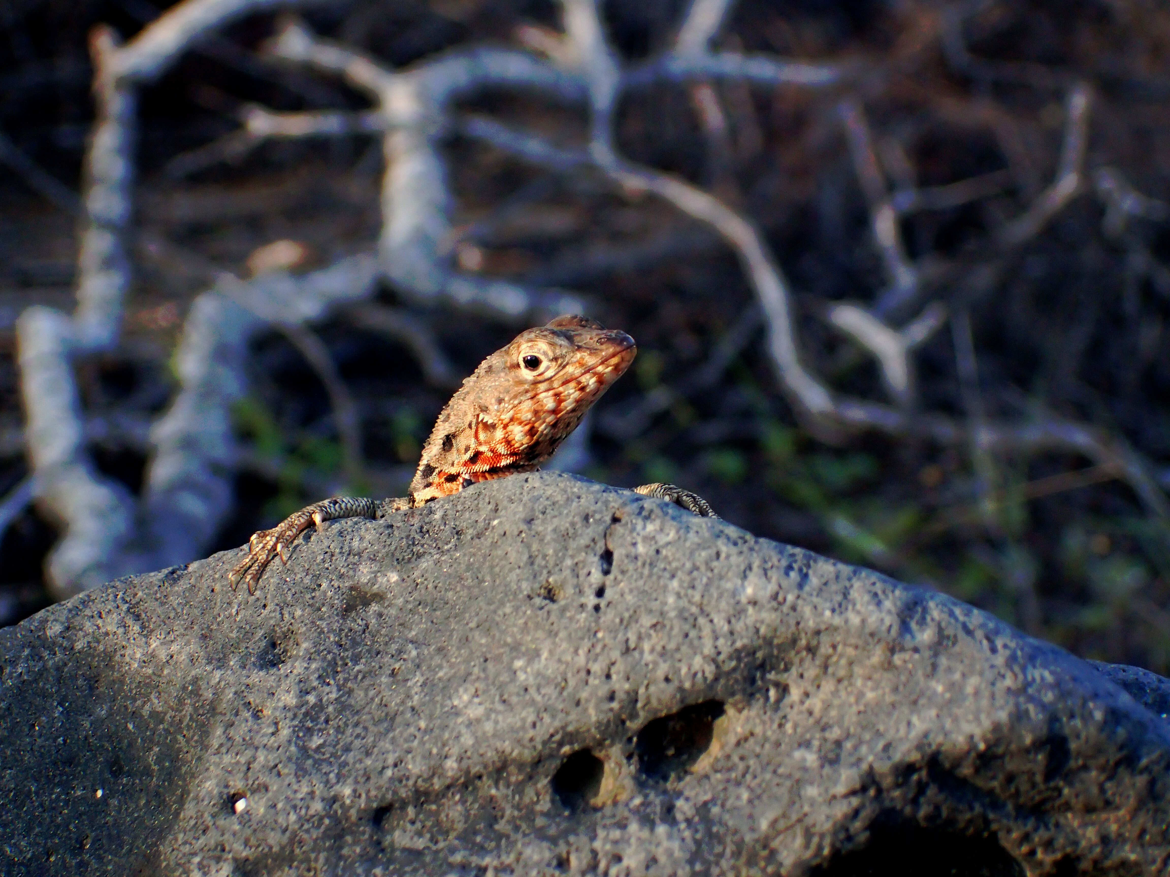 Today we explored a couple of small islands with unique ecosystems. Geologically speaking, North Seymour is an uplifted area. It has two types of sea lions, land and marine iguanas, various land birds, and many seabirds, including blue-footed boobies, seagulls, and frigates that mate all year long. We had a great morning exploring this flat and rocky spot full of wildlife.