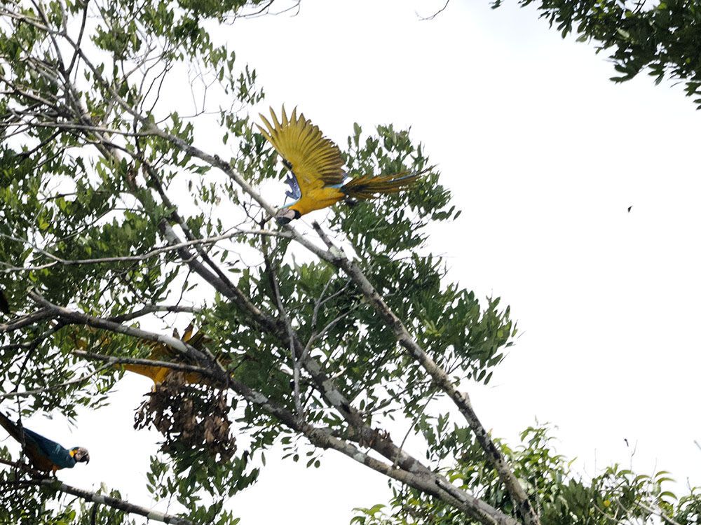 As we explored the forest, we entered caiman kingdom! We saw several large reptiles basking in the sun in the shallow murky waters. The trees were also full of surprises, including large flocks of blue-and-yellow macaws and the mysterious hoatzin! Not one or even ten…there were many! To me, these were the best of the sightings. We have been looking for them since the beginning of the expedition. Finally, in the deepest part of the reserve, we got our reward: dozens of macaws!