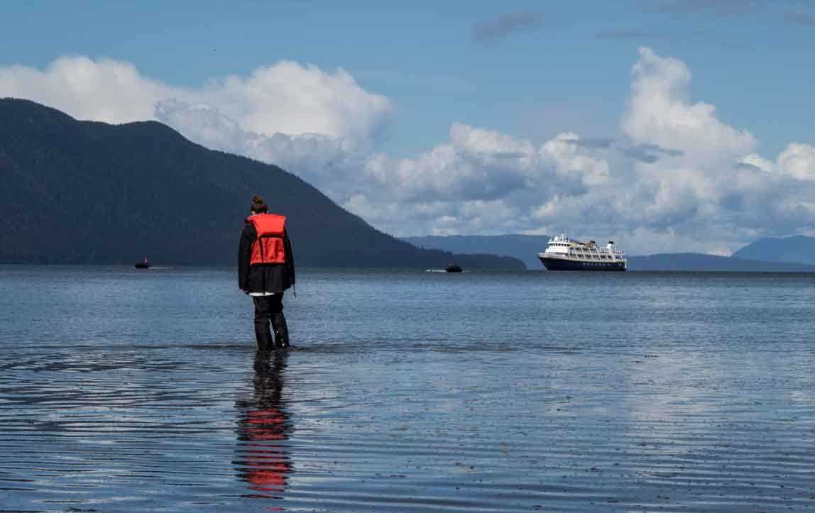 The ship arrived at Hanus Bay off Baranof Island and anchored for the afternoon. Time to bond with our rubber boots! Zodiacs zipped us ashore, and we swung legs over into the intertidal zone. Walkers separated into various groups of leisurely, moderate, photo and long aerobic walkers to experience this small portion of the enormous Tongass National Forest. What a great introduction to the temperate rainforest of Southeast Alaska… beautiful mixed forest following alongside a river, leading to old growth Sitka spruce trees at Lake Eva. We saw signs of deer, bear, squirrels, and heard the songs and calls of many birds. The weather remained pretty even, with a few sprinkles, followed by clearing and bright sunshine. At this writing we are gathering in the lounge for cocktails and appetizers.