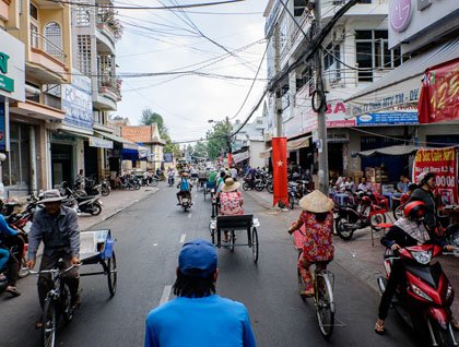 We docked along the banks of the Tonle Sap and disembarked Jahan for an exciting adventure. We rode in the front of local cyclos, which are basically carts, pedaled by very strong and wiry Cambodian men. The traffic was quite overwhelming and we were taken all over the main parts of the city. We rode past the Central Market, the beautiful Post Office, the U.S. Embassy, and countless bars, motorbike repair shops, and belt manufacturers. Much of downtown Phnom Penh does not have traffic signals, so everyone snakes through intersections, taking up whatever space is available at the time. Our ride ended at the square in front of the Royal Palace and our guides began a walking tour of the complex.
