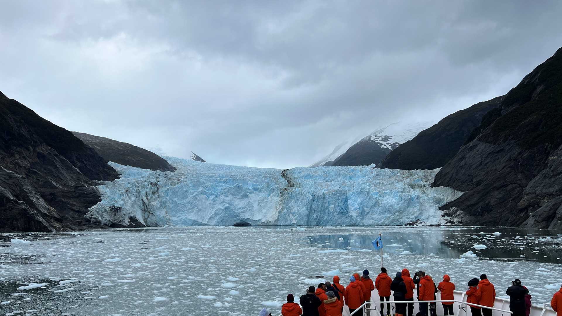 It was our first day in Patagonia. It was a pleasure to be back among some green scenery, although there was some residual sadness of having left behind Antarctica. This morning, we toured the Ventisquero Romanche and Pia Glaciers, which flow into Pia Fjord. A peaceful Zodiac ride brought us close to the front of the glaciers where we could watch calving in action, creating the icy wonderland that we were floating upon. Dressed for the weather, we enjoyed the light drizzle which filled the waterfalls and created misty layers against the dramatic metamorphic rock-scapes.