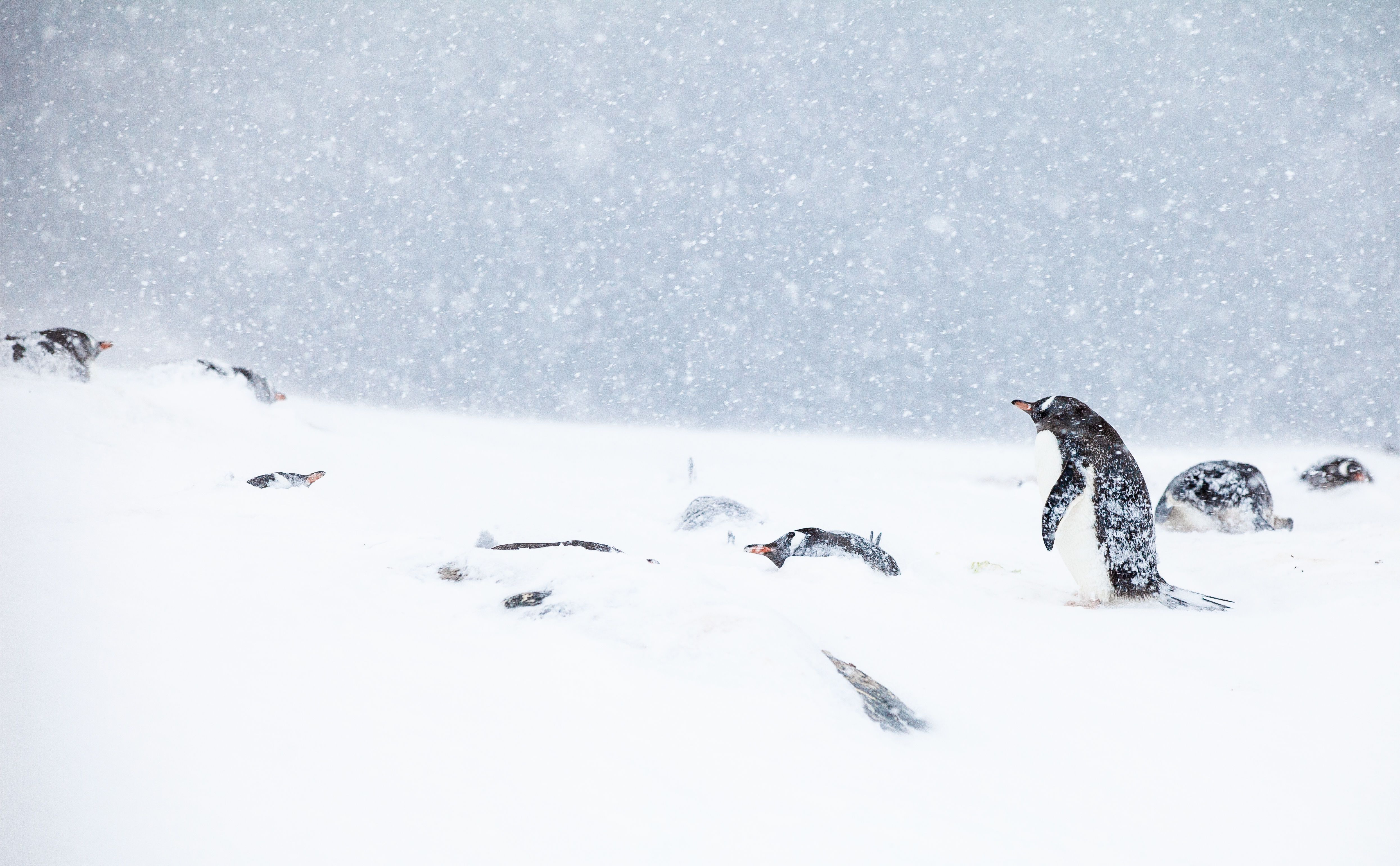 This island and nearby Jougla Point host roughly 1,600 breeding pairs of Gentoo penguins. The penguins build stony nests on exposed rocks, an important process complicated by the season’s heavy snowfall. Gentoo penguins are more adaptable than other penguin species in Antarctica, but the heavy layers of snow that block access to nesting sites is a challenge even for them.