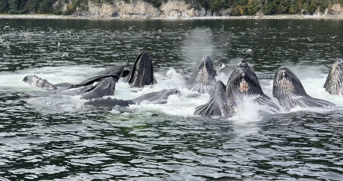 Our last day in the Great Bear Rainforest proved to be one full of excitement, education, and awe. After dropping anchor in the idyllic glacial fjord of Green Inlet, we set out to explore the rocky shoreline and forested granitic fjord walls. The dense fog gradually turned into a wispy mist, which exposed different peaks and valleys of the forest as it moved through. We took turns kayaking through a delightful cove that was loaded with ochre sea stars, rockweed, and blue mussels so thick and dense that the rock they were attached to was hardly visible between them. A river otter scurried along the shore and bald eagles soared above us. From the Zodiacs we visited nearly a dozen thunderous waterfalls that were running hard and fast from the heavy overnight rains. We observed harbor seals observing us back; they were quietly periscoping their furry heads up and out of the water as we approached the rapids where they were hunting salmon making their final journeys upriver to spawn. Upon our return to National Geographic Venture , expedition diver Nick Brown shared his extensive underwater video footage from the area. His presentation was interrupted, of course, by whale sightings, which we rushed onto the bow to appreciate.